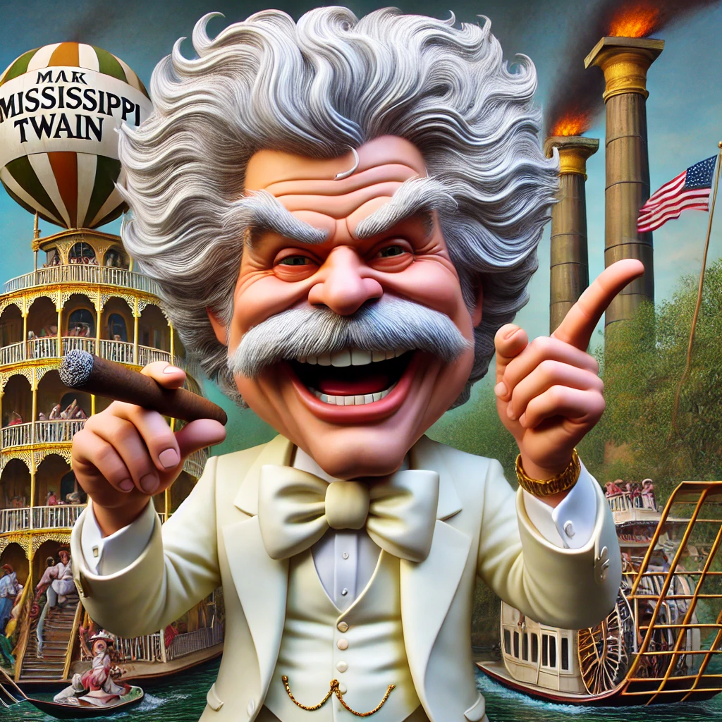 Depicted with his wild white hair, a cigar between his teeth, and a mischievous grin, Twain radiates charisma and humor. In the background, majestic steamboats sail along the Mississippi River, evoking the setting of his masterpieces The Adventures of Tom Sawyer and The Adventures of Huckleberry Finn.