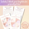 A relaxing and uplifting bingo sheet featuring self-care actions like affirmations, bubble baths, journaling, and candles. Perfect for a spa-themed vibe.