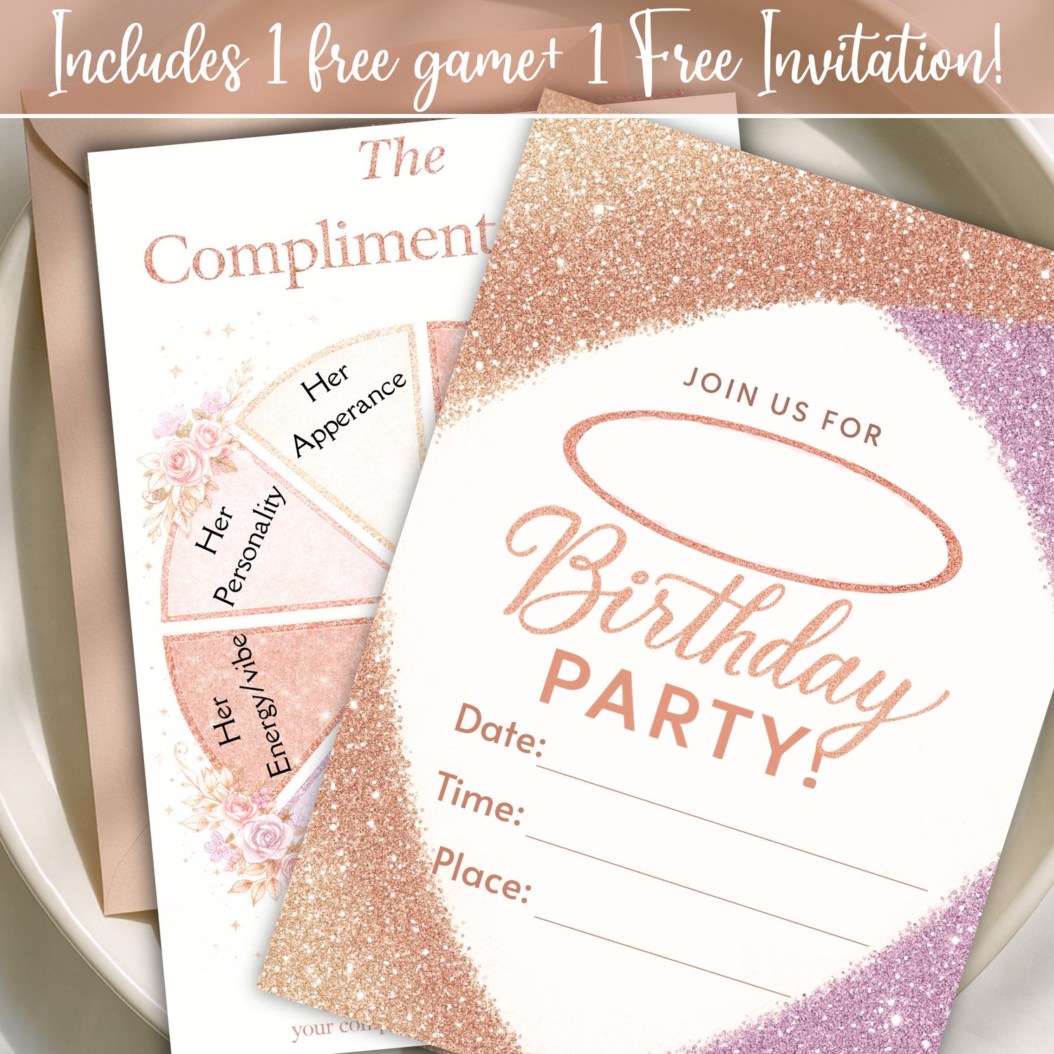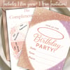 Tags: birthday invitation, glitter invite, rose gold party, editable template, glam printable