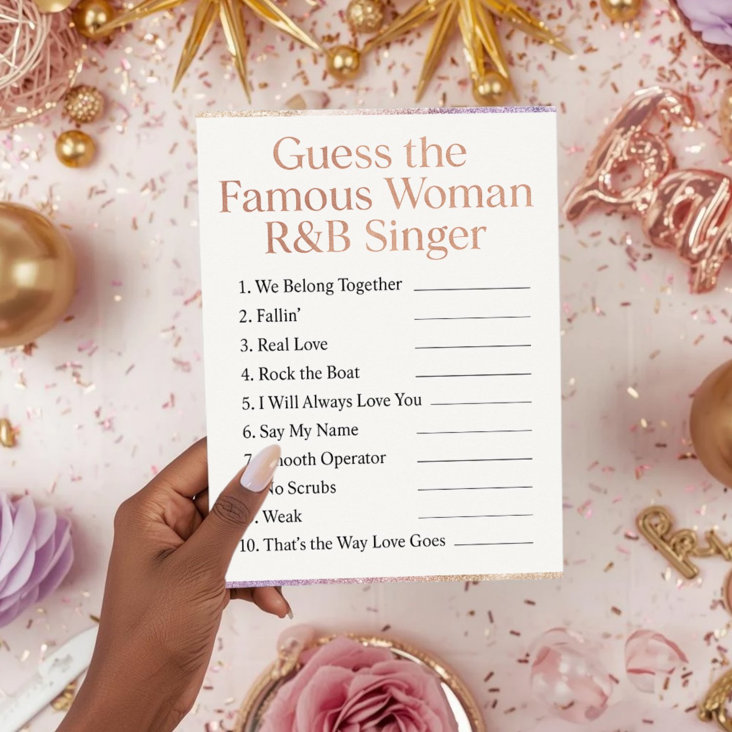 A fun music-themed game listing iconic R&B hits sung by legendary women. Guests guess the singer for each song. Gorgeous glitter design makes it both fun and display-worthy.
