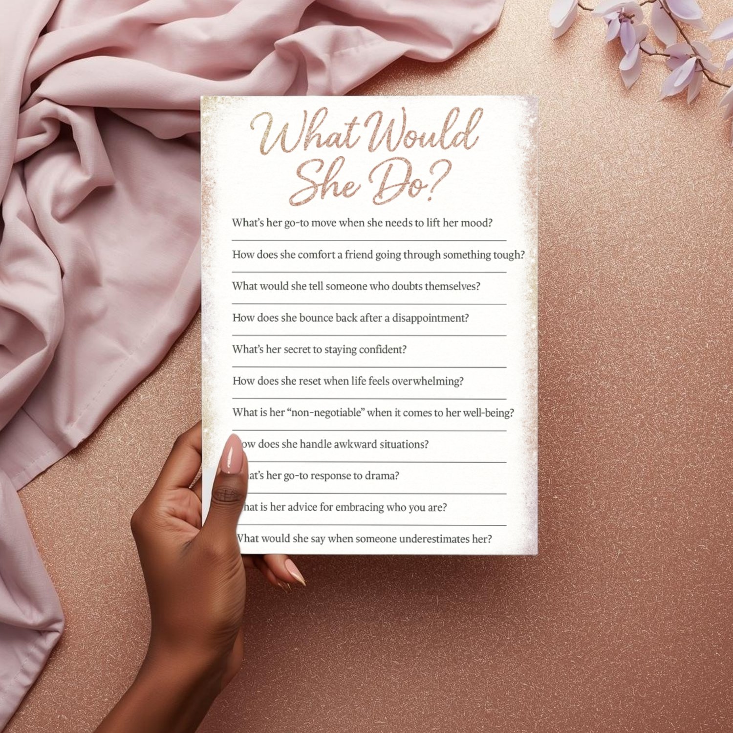 A thoughtful and funny scenario-based game where guests predict how she’d react to real-life situations involving stress, confidence, drama, awkward moments, and more.