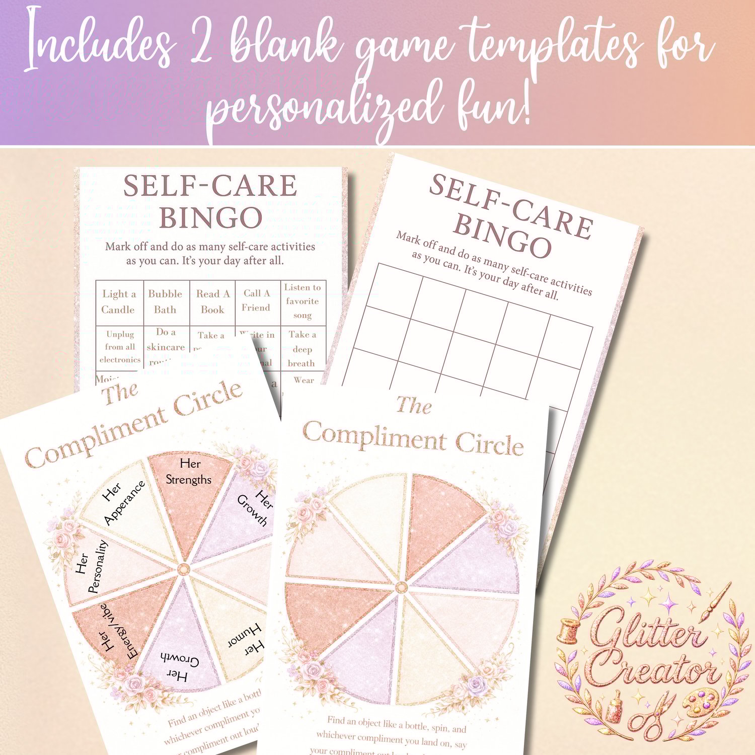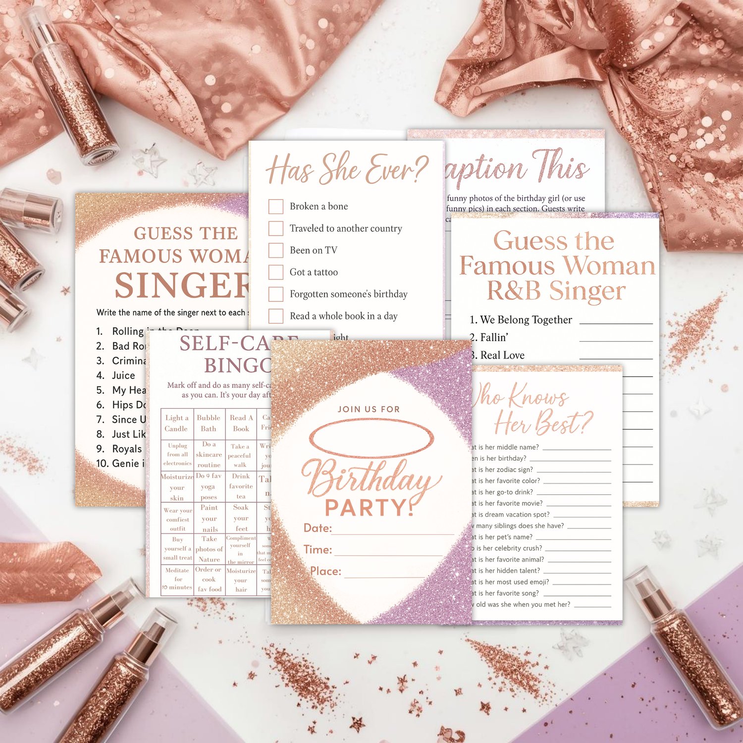 A luxurious collection of glitter printables designed for the birthday Lady who deserves a sparkling celebration. This bundle includes emotional, funny, and interactive games + a beautiful invitation + keepsake pages. Perfect for girls’ nights, milestone birthdays, glam parties, and feminine celebrations.