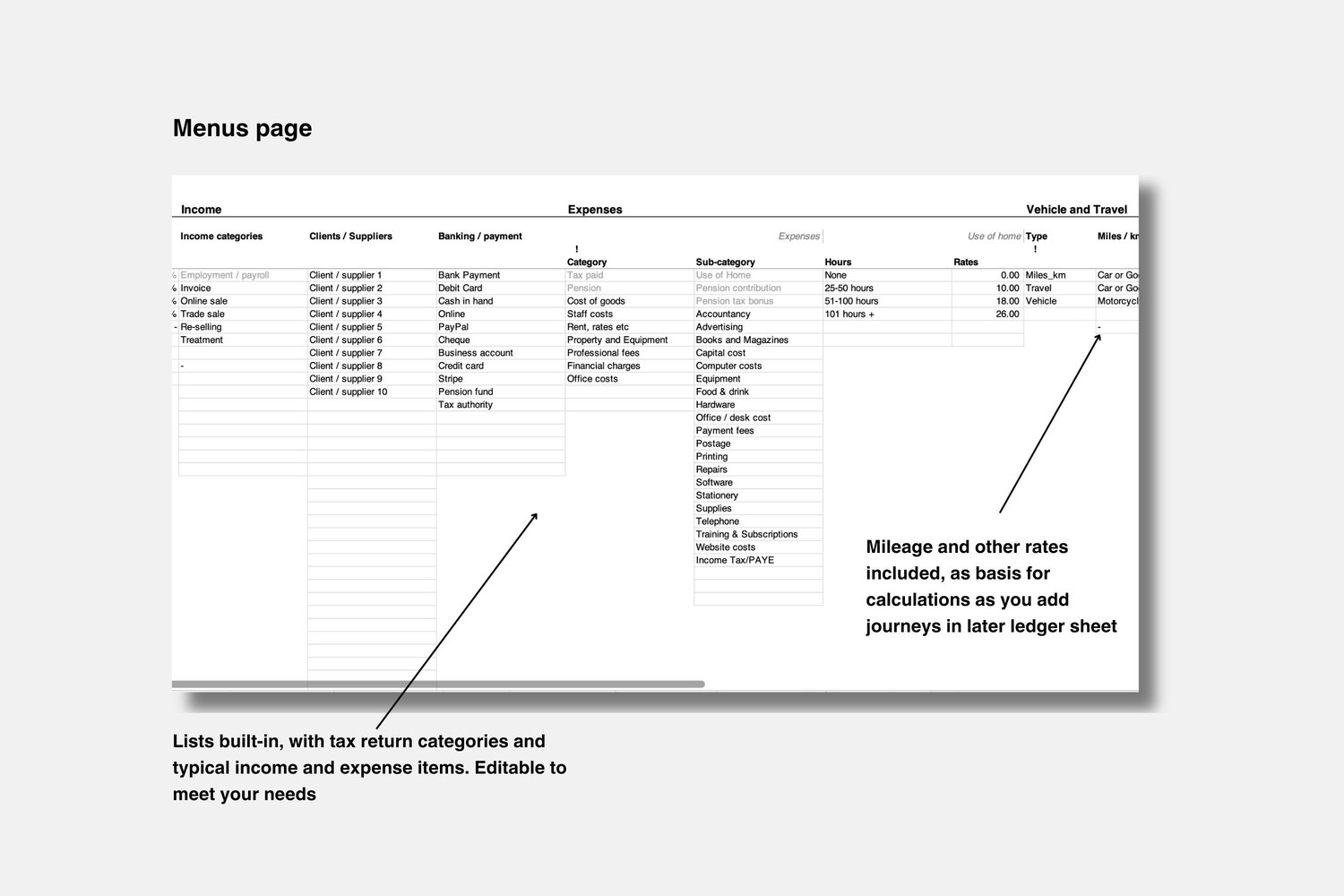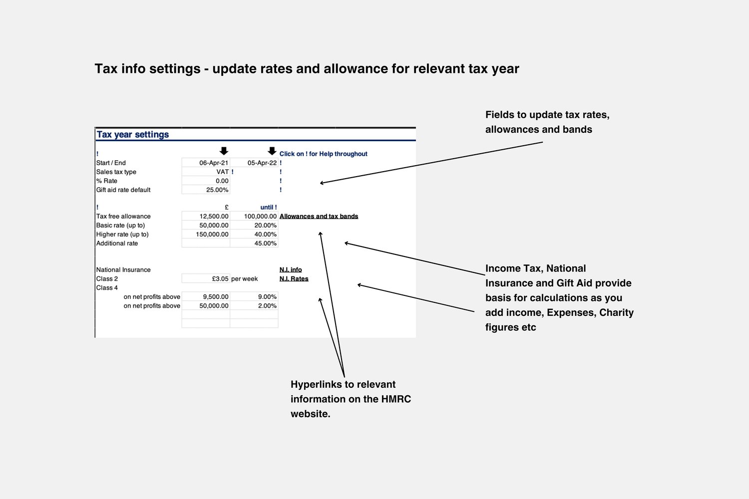 -Fields to update tax rates, allowances, tax bands, mileage and other rates, so template can be used for each subsequent tax year.