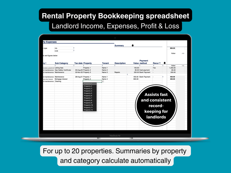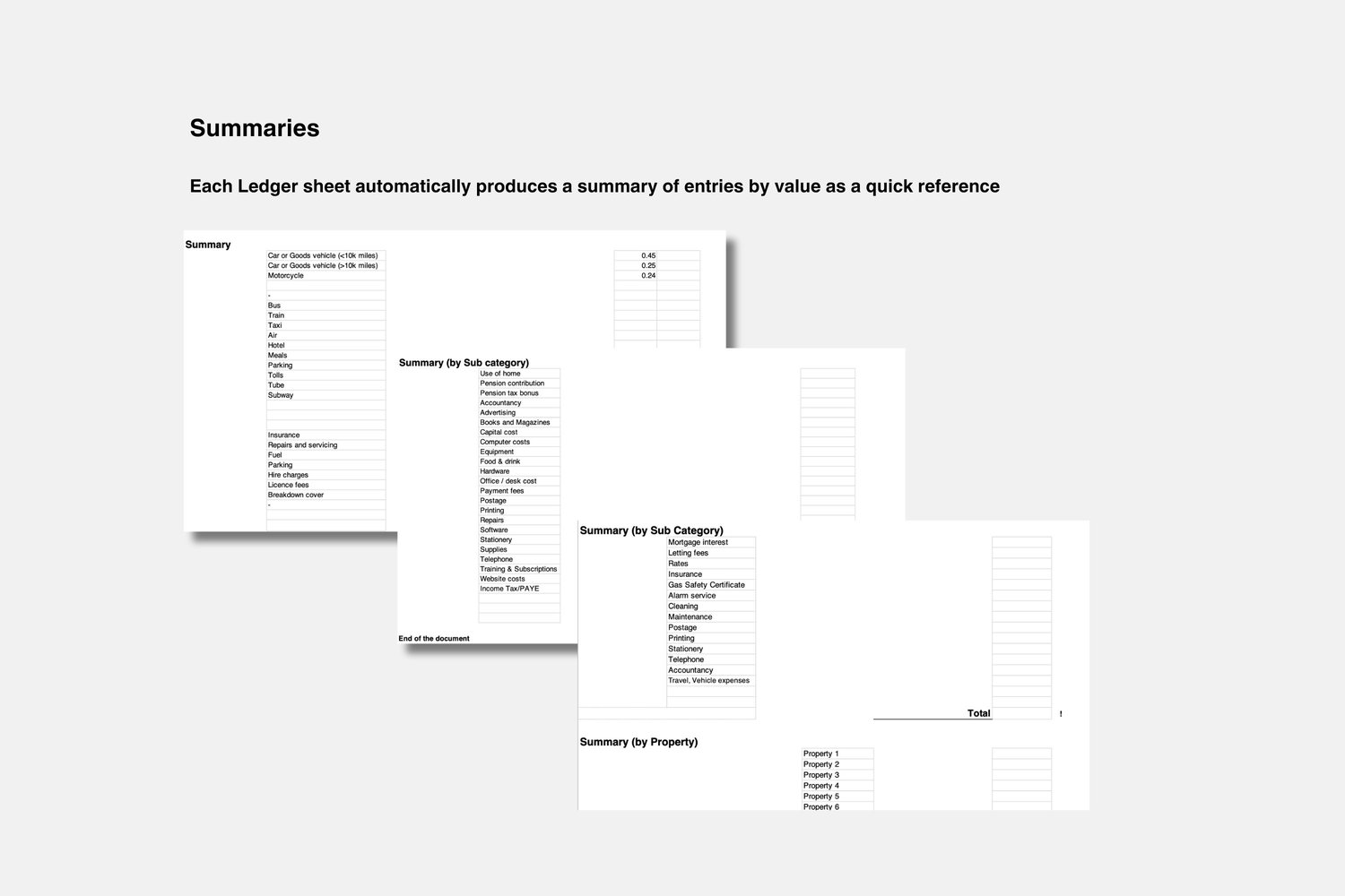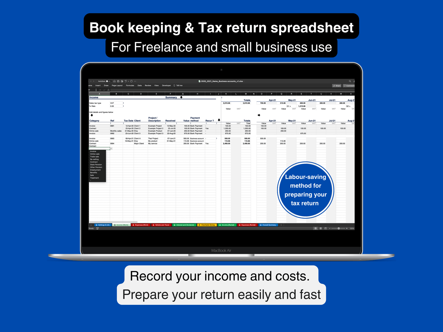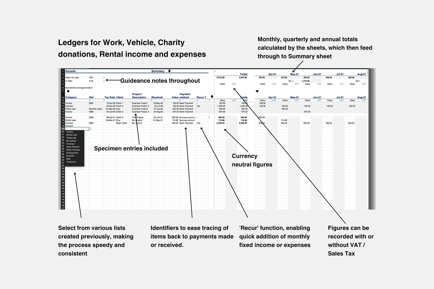 Added dates and values will automatically feed into figures for monthly, quarterly and annual totals. Summary in each section provides breakdown by relevant categories of income and expenses.