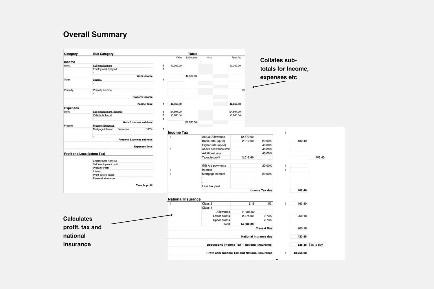 -Overall Summary sheet including calculations of sub-totals, Income Tax, National Insurance (Class 2 and 4).*