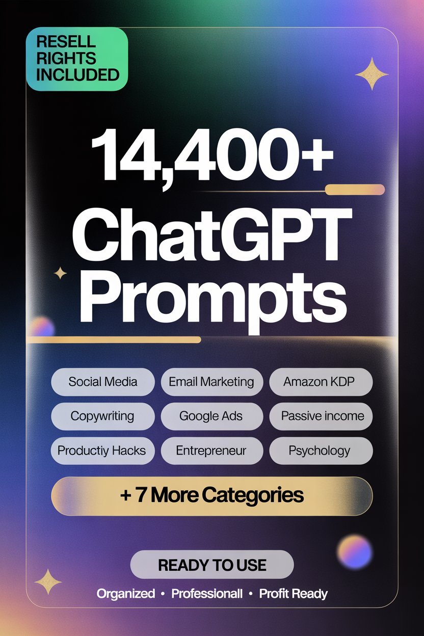 14,400 categorized, ready-to-use prompts across 17 categories — plus full resell rights, meaning you can sell this exact bundle and keep 100% of the profit. It's both a tool and a business in one download.