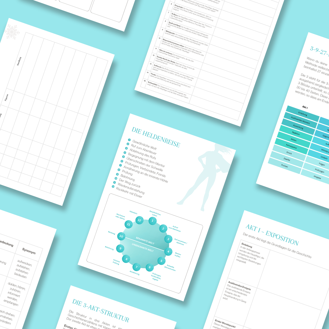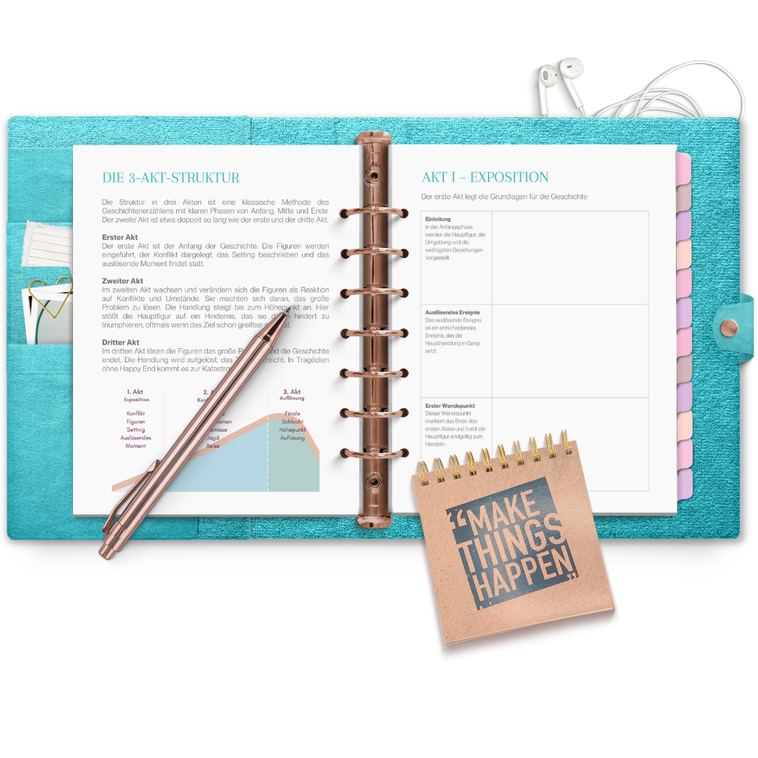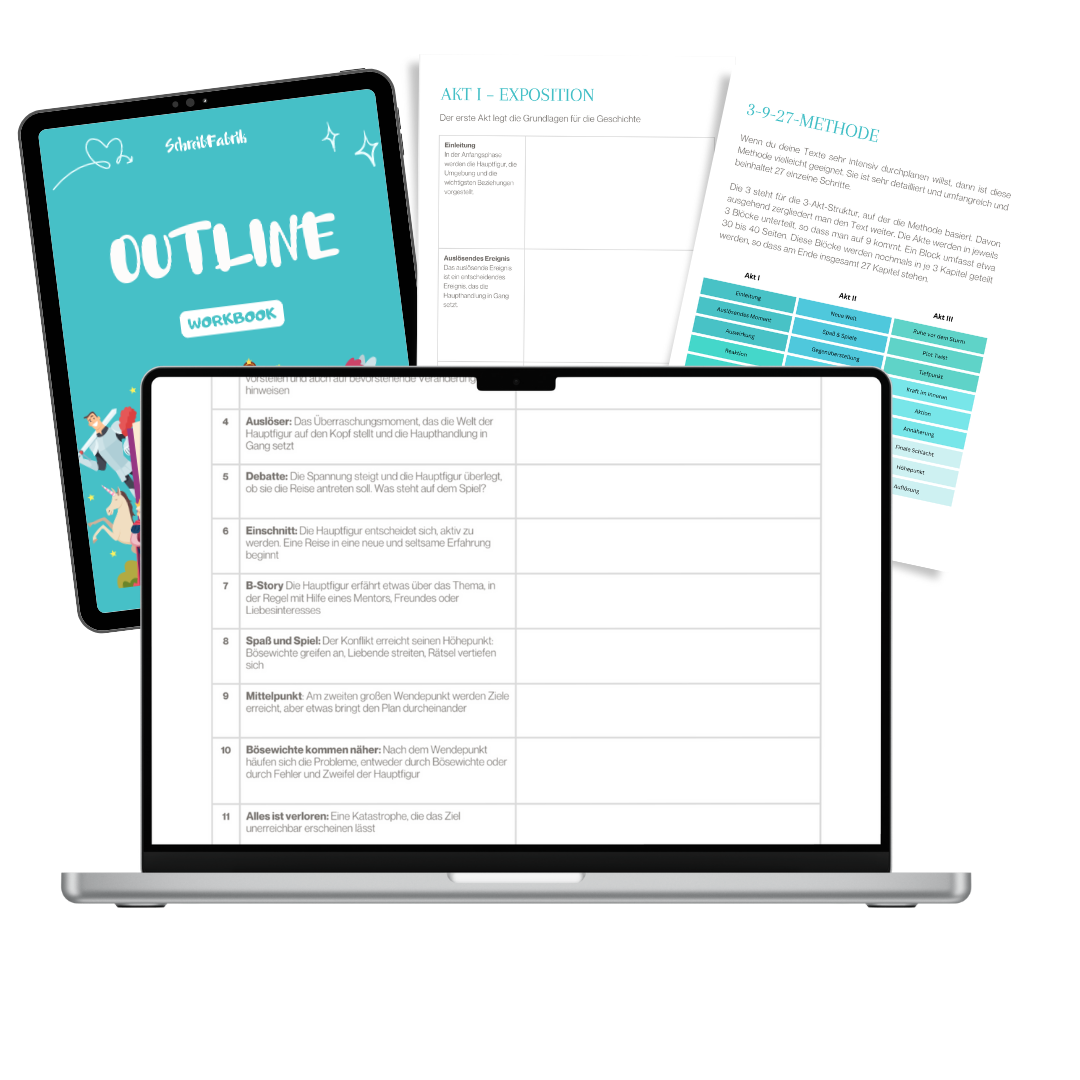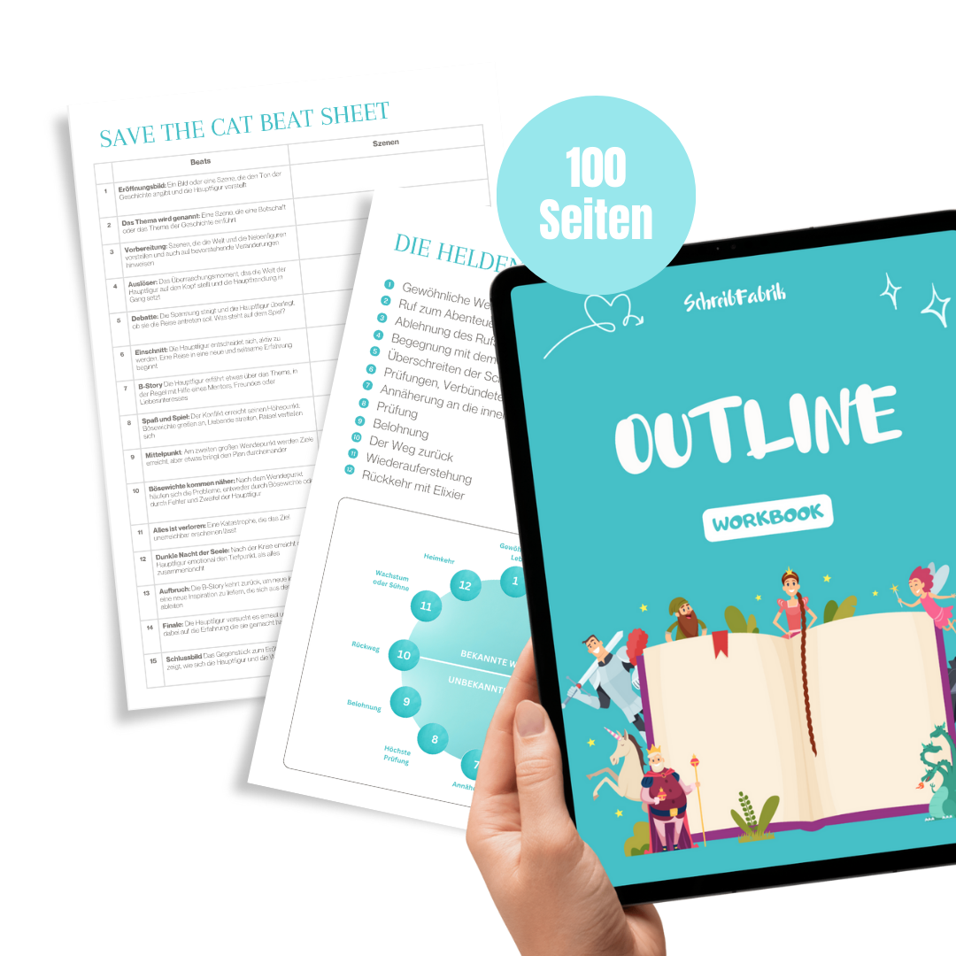 Das Outline Workbook hilft dir, deine Story zu strukturieren und zu planen. Auf 100 Seiten findest du Templates und Vorgaben zum Plotten, von der ersten Szene bis zum runden Ganzen. Egal ob 3-Akt-Struktur, Heldenreise oder Beat Sheet. Mit dem Workbook kannst du deine Geschichte Schritt für Schritt nach Anleitung aufbauen.