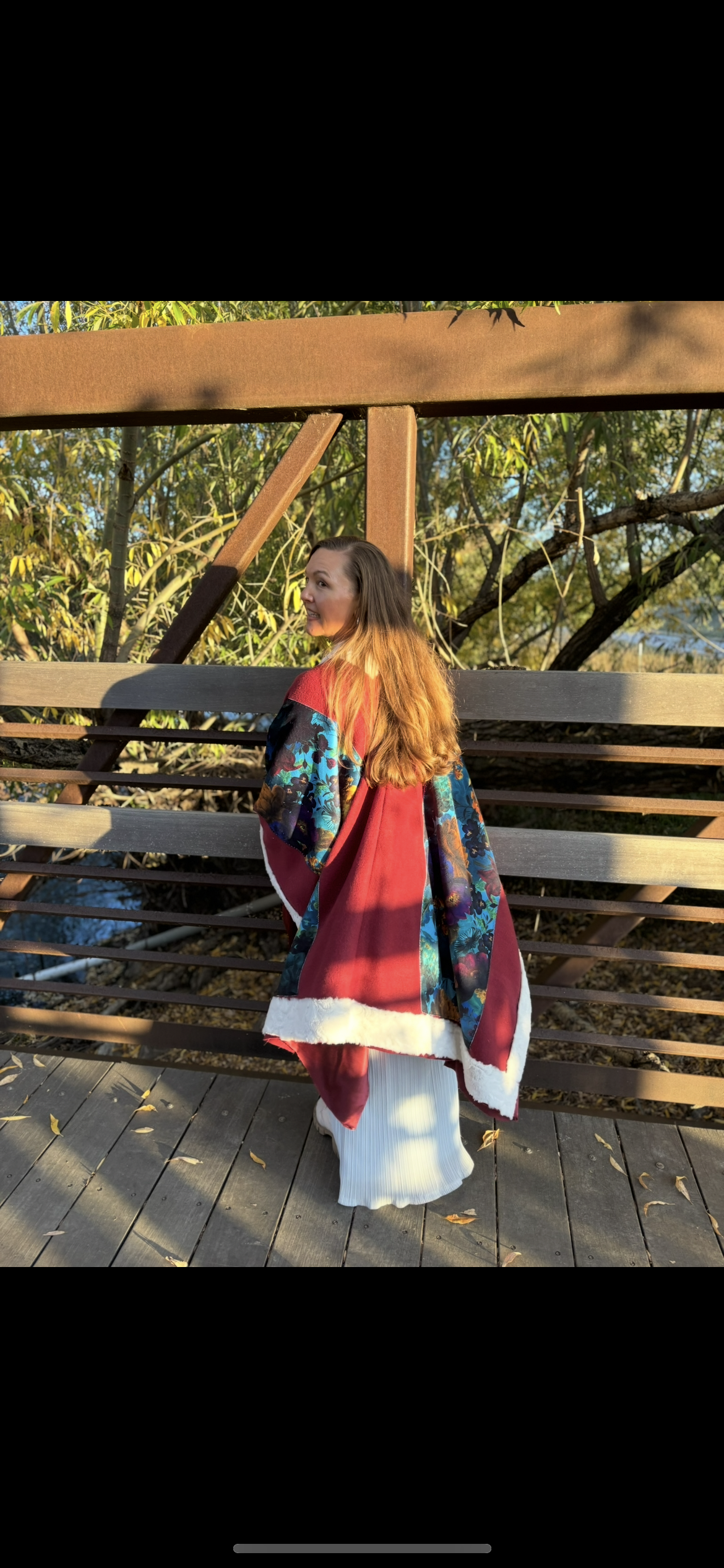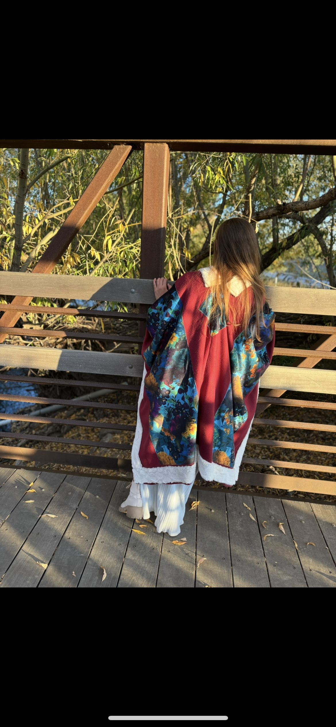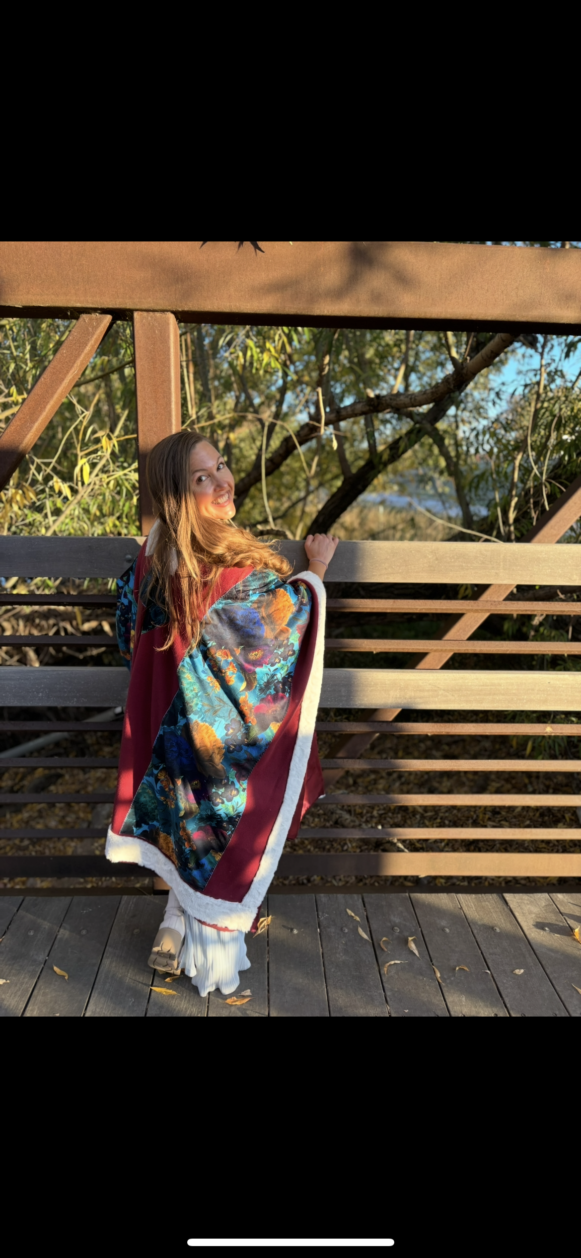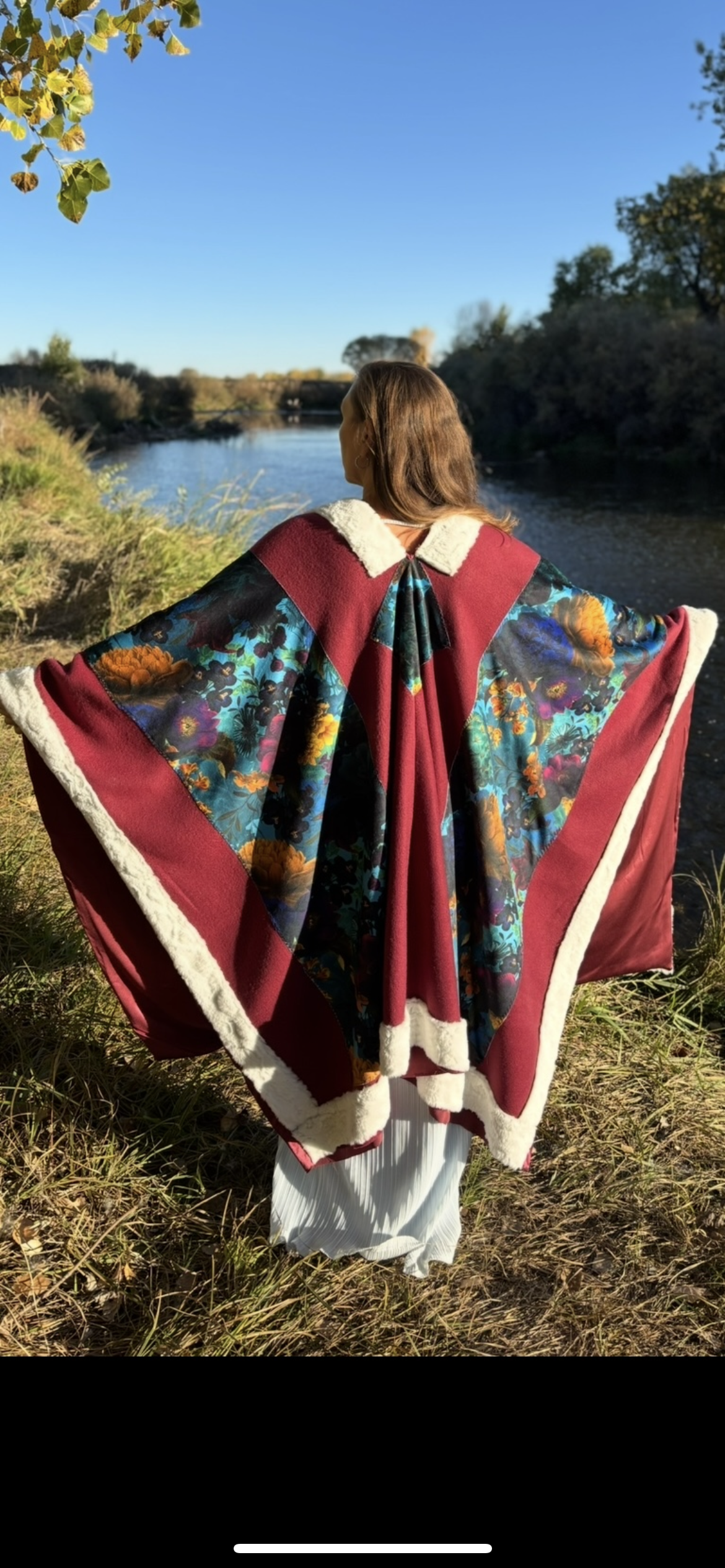 Soft, warm and beautiful open Poncho, fully lined. Made with Fleece, Minky velvet, Sustainable Satin and Faux Fur.