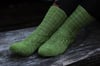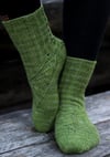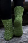These cuff-down socks are a combination of two beautiful cables and ribbing. The design is quite unisex and works for both men and women. The gusset decreases are placed on top of the instep to make room for cables that meet in the middle just before the toes.