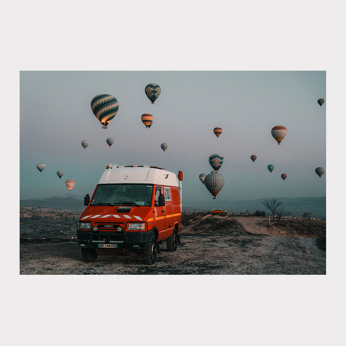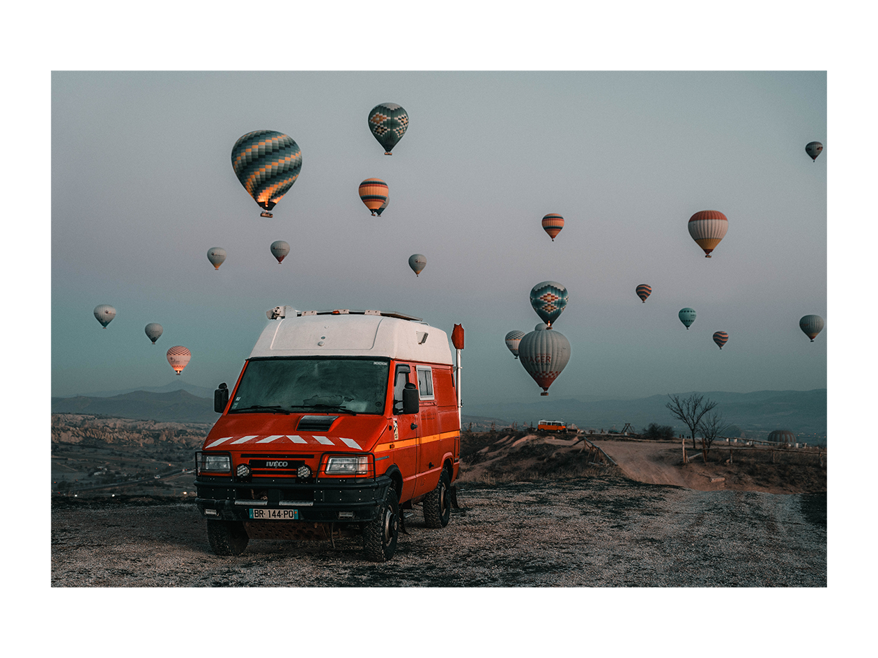 Cette photo a été prise près de Göreme, en Cappadoce, lors d’un réveil hors du temps. Au petit matin, le bruit des brûleurs m’a tiré du sommeil, laissant apparaître autour de moi des centaines de montgolfières s’élevant lentement dans les vallées. Marco, mon compagnon de route et ma maison sur roues, se retrouvait alors au cœur de ce ballet aérien guidé par le vent. Aux premières lueurs du jour, le ciel s’est rempli de couleurs et de mouvement, transformant ce simple bivouac en l’un des réveils les plus mémorables de mon aventure.