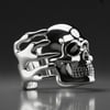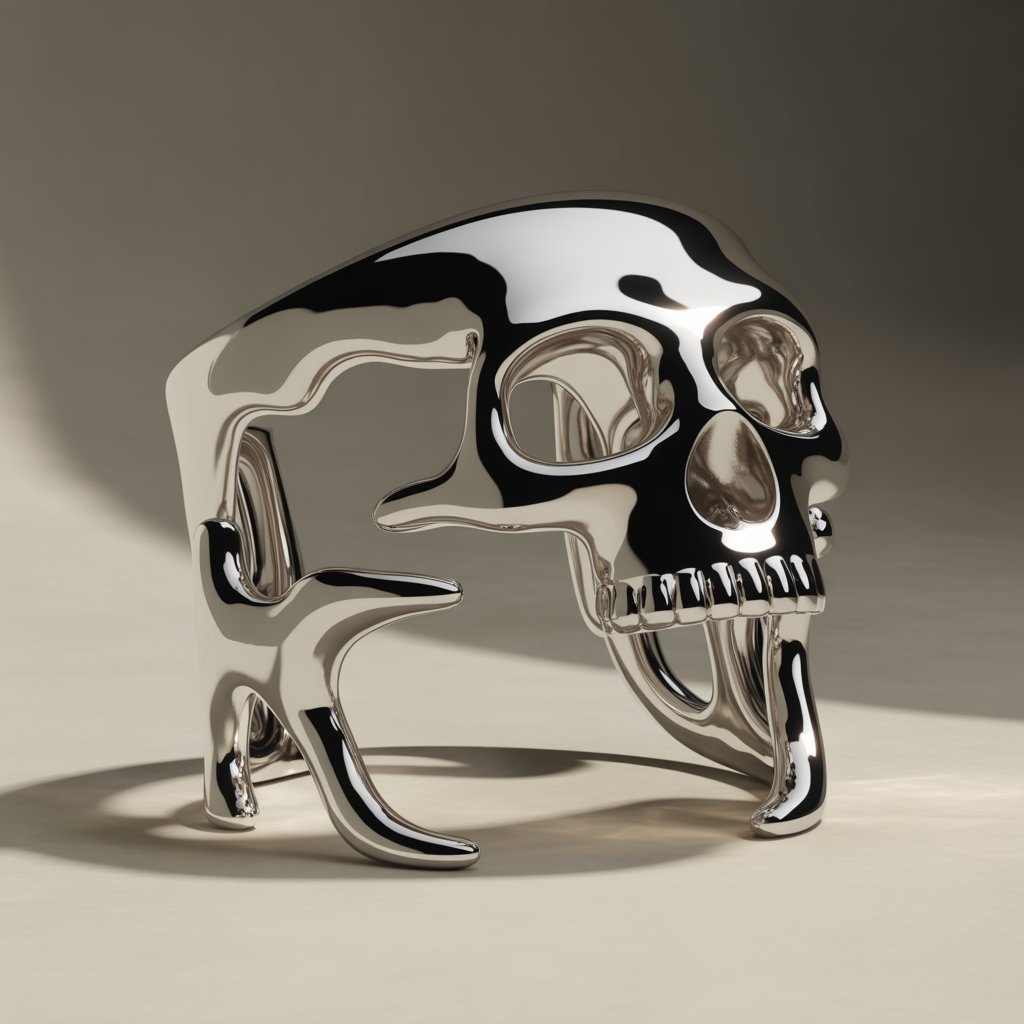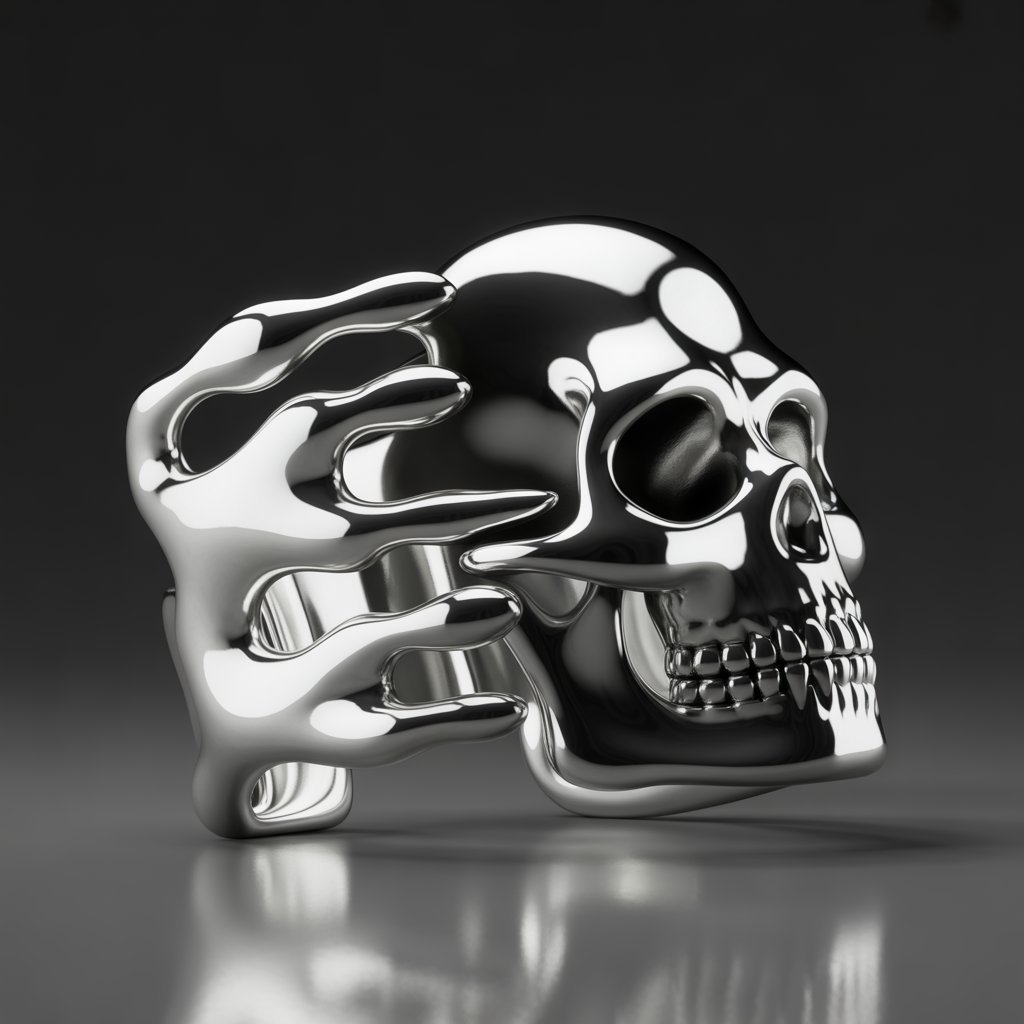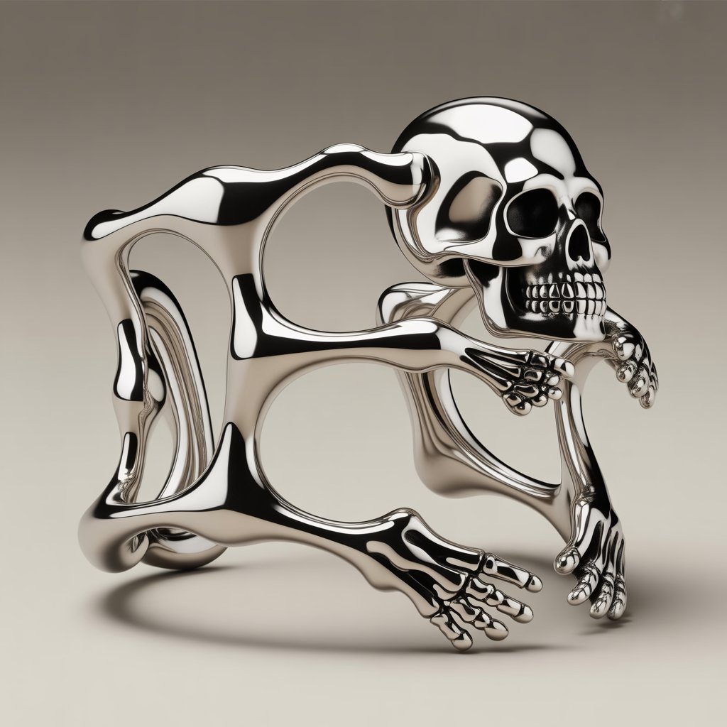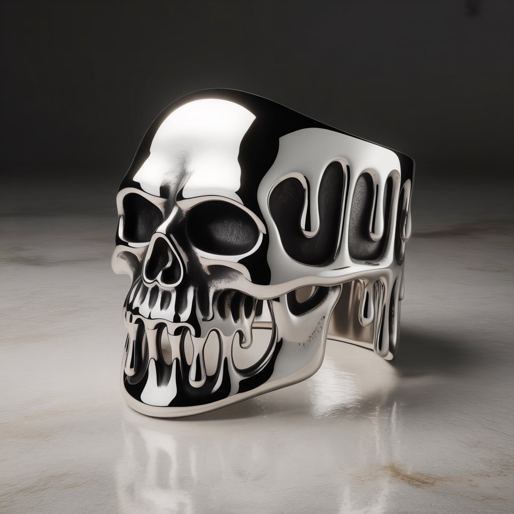Hyper-detailed 3D render of a chrome silver skull cuff bracelet. Expressionistic distorted forms, fluid melting aesthetic, ZBrush style. Abstract expressionism meets luxury jewelry design.