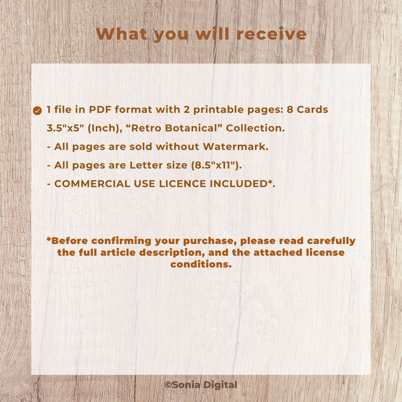 🔸2 printable pages: 8 Cards 3.5”x5”, “Retro Botanical” Collection, in Letter size 8.5”x11”. All pages are sold Watermark-free. Commercial use license included*.