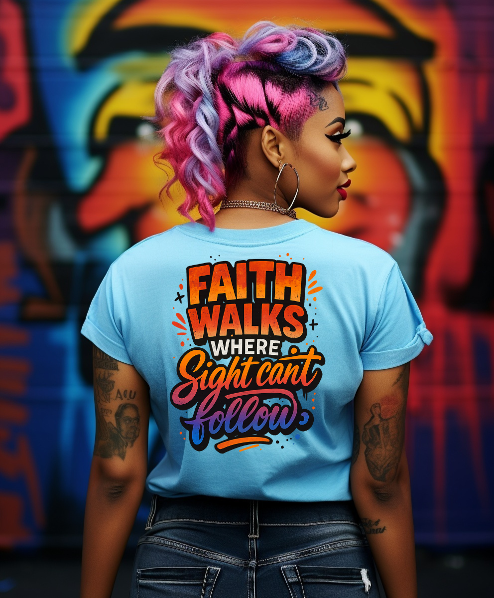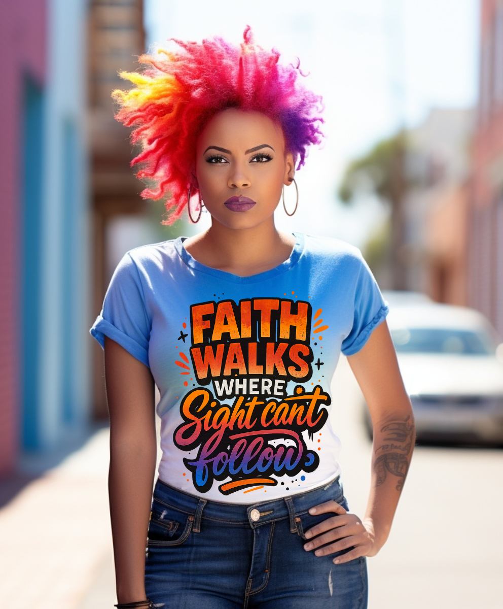“Faith walks where sight can’t follow” in vibrant ombré text with graffiti flair.