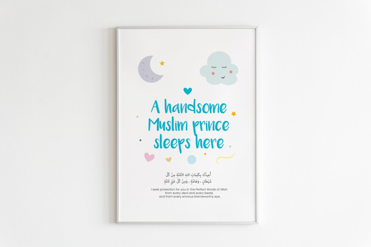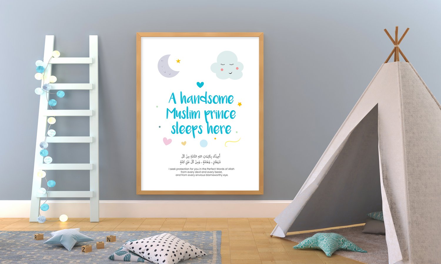 Print Reads: A Beautiful Muslim Prince sleeps here, followed by the dua of protection that Prophet Muhammad (SAW) used to recite to seek for protection for his grandchildren, Hassan and Hussain.