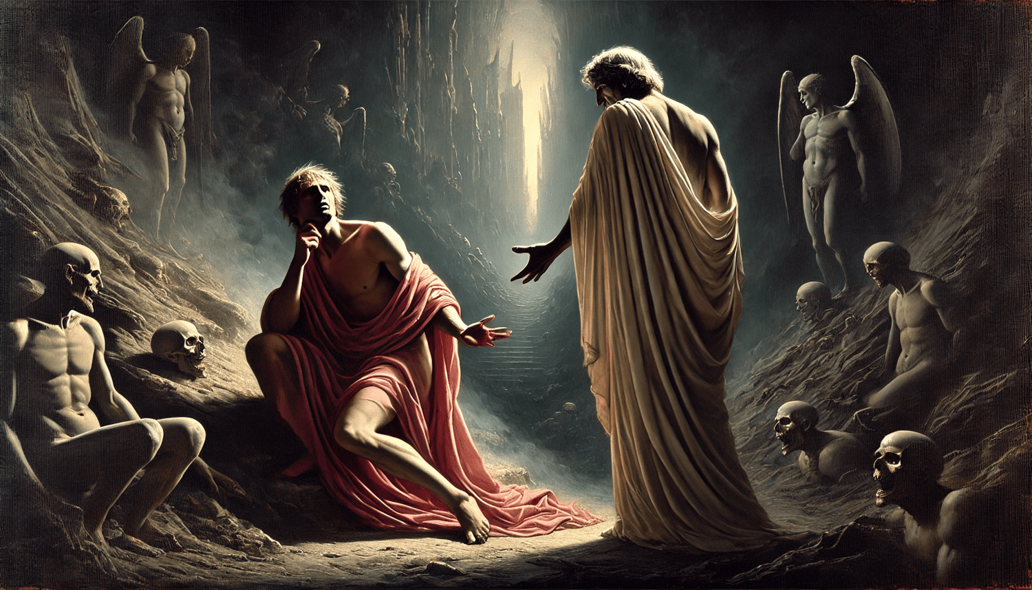 Dante’s Protest and Virgil’s Appeal is a digital artwork from the Dante’s Italy collection, illustrating a pivotal moment in Inferno where Dante hesitates at the threshold of Hell, overwhelmed by fear and despair. Virgil, his guide and symbol of reason, extends his hand in reassurance, urging him to continue the journey.