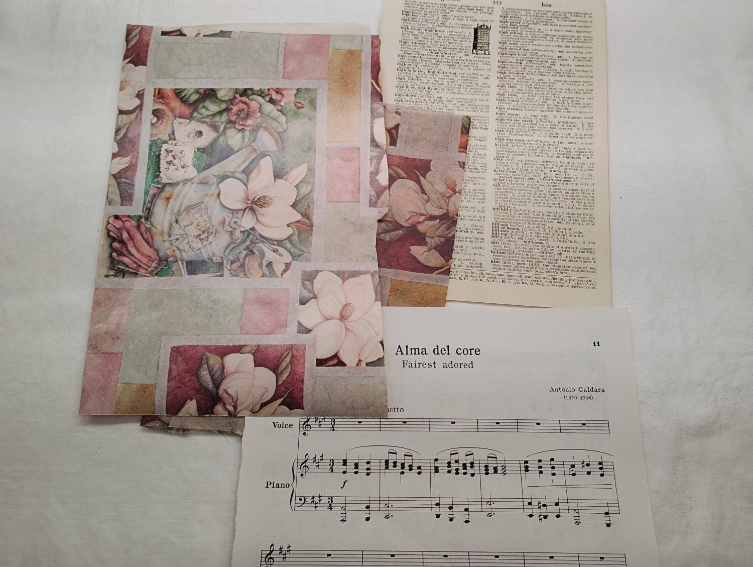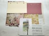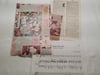 A small ephemera pack centered around a semi-sheer dusty light olive green beaded fabric. Included is wrapping paper, lace, scrapbook and decaupage papers, deconstructed jewelry, and other small pieces all color coordinated and ready to complement a bigger project.