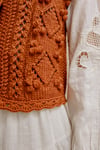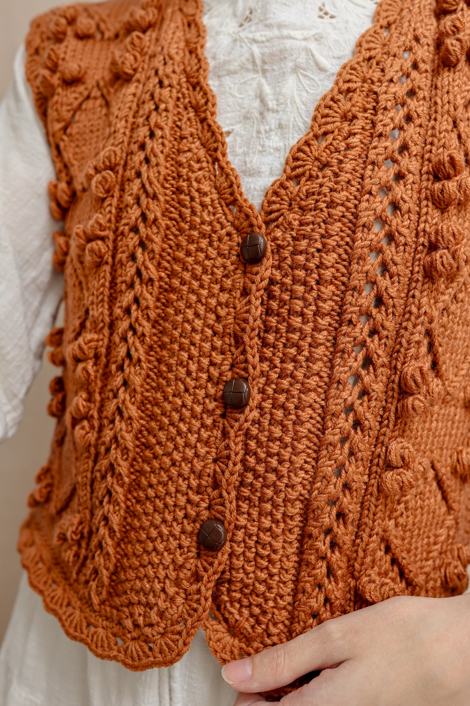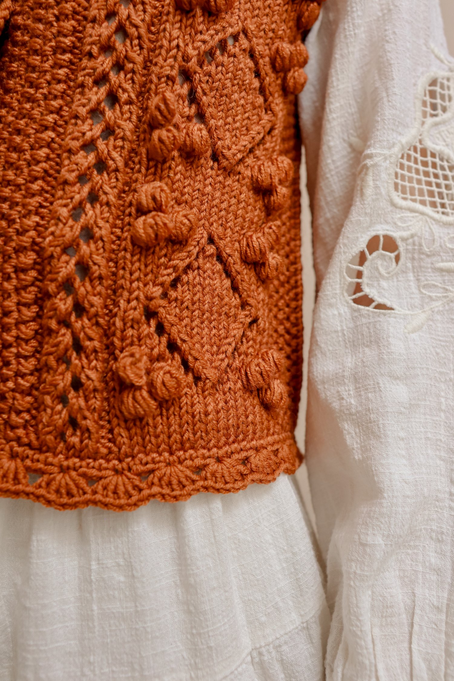 The Babette Bobble Vest is a vintage inspired drop shoulder vest with bobbles, lace and seed stitch.