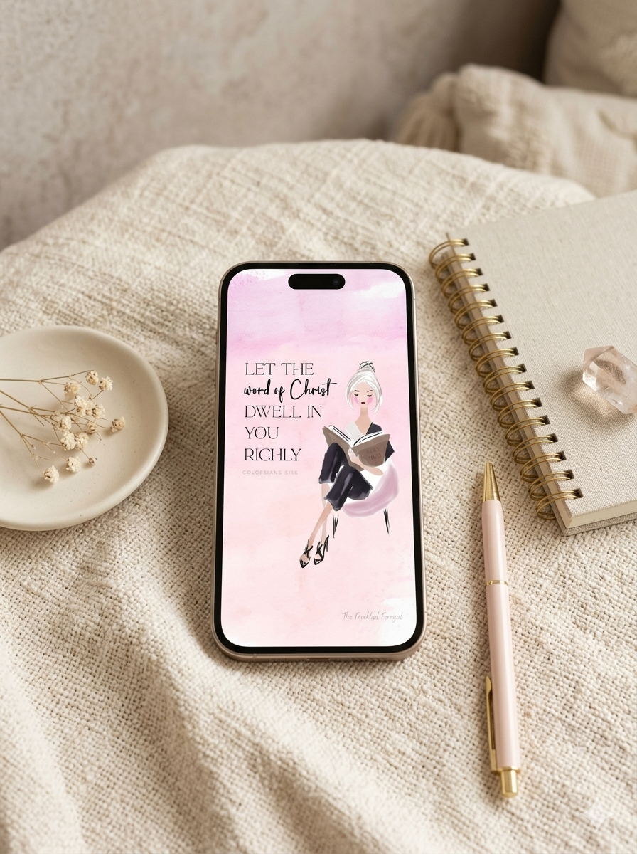 This soft and elegant Christian iPhone wallpaper features the powerful scripture from Colossians 3:16 — “Let the word of Christ dwell in you richly.” Designed with a feminine pink watercolor background and a peaceful illustration of a woman reading her Bible, this wallpaper is a daily reminder to stay rooted in Scripture.