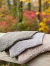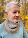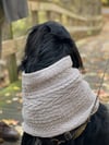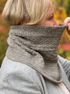SEA WHISPER is a one skein*, unisex, textured cowl, knit top down in the round, using Gansey-inspired stitches. This funnel-like shaped cowl gives you extra warmth around the neck and shoulders, with its narrower top half keeping you snug as a bug!