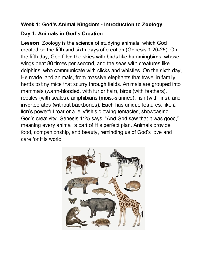 Dive into a thrilling 60-day adventure exploring God’s incredible animal kingdom! Designed for 4th graders, this zoology workbook unveils the marvels of animals—from soaring eagles to tiny ants—through engaging lessons, fun activities, and creative drawing prompts. Discover habitats, adaptations, life cycles, behaviors, and food chains, all while learning to care for creation as God’s steward. With a Christian worldview and inspiring Bible verses, this journey sparks awe and responsibility for God’s wild wonders!