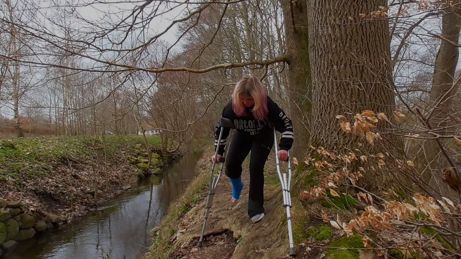 Nathalia is somehow stranded outside of the city right now and is trying to find the best way home. Bad thing is, her right leg is very much broken and casted in a blue SLC. With her American crutches, Nathalia makes her way through dirty roads and across grass, going straight into a woody terrain. She’s exhausted and stops quite often to catch her breathe, hot amazing closeups are coming in continuously throughout the entire clip. She now find herself crutching on a small trail as a water stream shows up, the terrain has gotten pretty rough and challenging. The trail gets more and more narrow to stay on as it shrinks drastically, with uneven muddy ground and big roots growing in the way. Another stream is showing up as well, water on both sides now, yikes! she has to climb and hop over trees today, It looks dangerous! Let’s hope that she doesn’t fall and get caught up in the two streams.