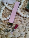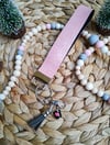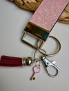 Il braccialetto portachiavi è ornato da un ciondolo, una nappina e un gancio girevole in acciaio.