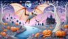A selection of cute bats on a spooky wallpaper with haunted houses, tombstones, curly white trees, lakes & pumpkins. There are bats silhouetted in the distance.