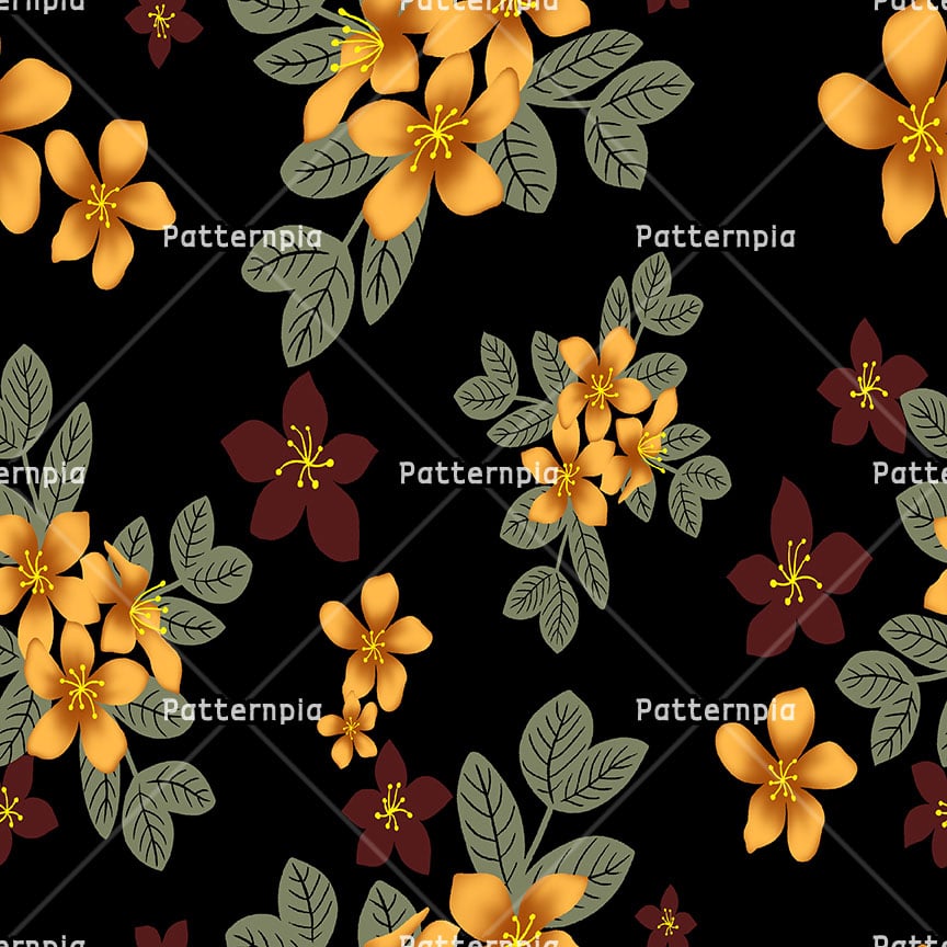 Elegant amber and maroon blossoms on a black ground.
