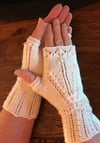 Magic Flower Fingerless Mitts use Estonian lace patterns to bring a touch of elegance and beauty to your hands. These mitts will keep your hands warm while texting or attending a Spring or Autumn wedding, prom, or other social event.