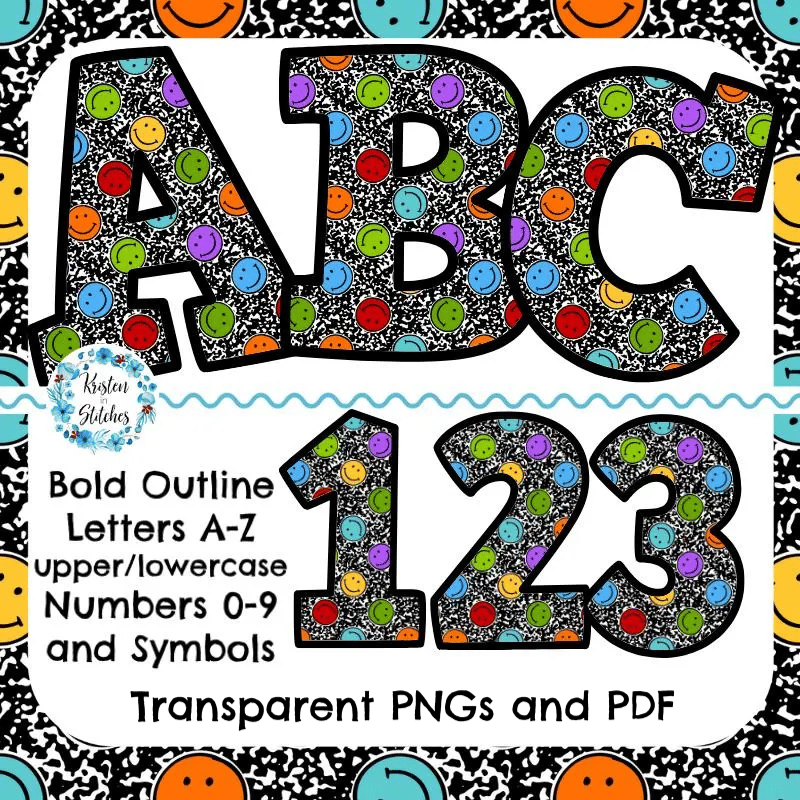 Pastel Happy Face Composition Notebook Alphabet Letters A-Z Numbers 0-9 Symbols PDF Transparent PNGs Bulletin Board Word Walls