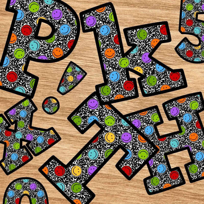 Colorful smiley faces on black composition notebook texture. Print and cut these alphabet, numbers and symbols. This set includes uppercase and lowercase letters A-Z and numbers 0-9 and common symbols. See photo for a visual of the letters and numbers.