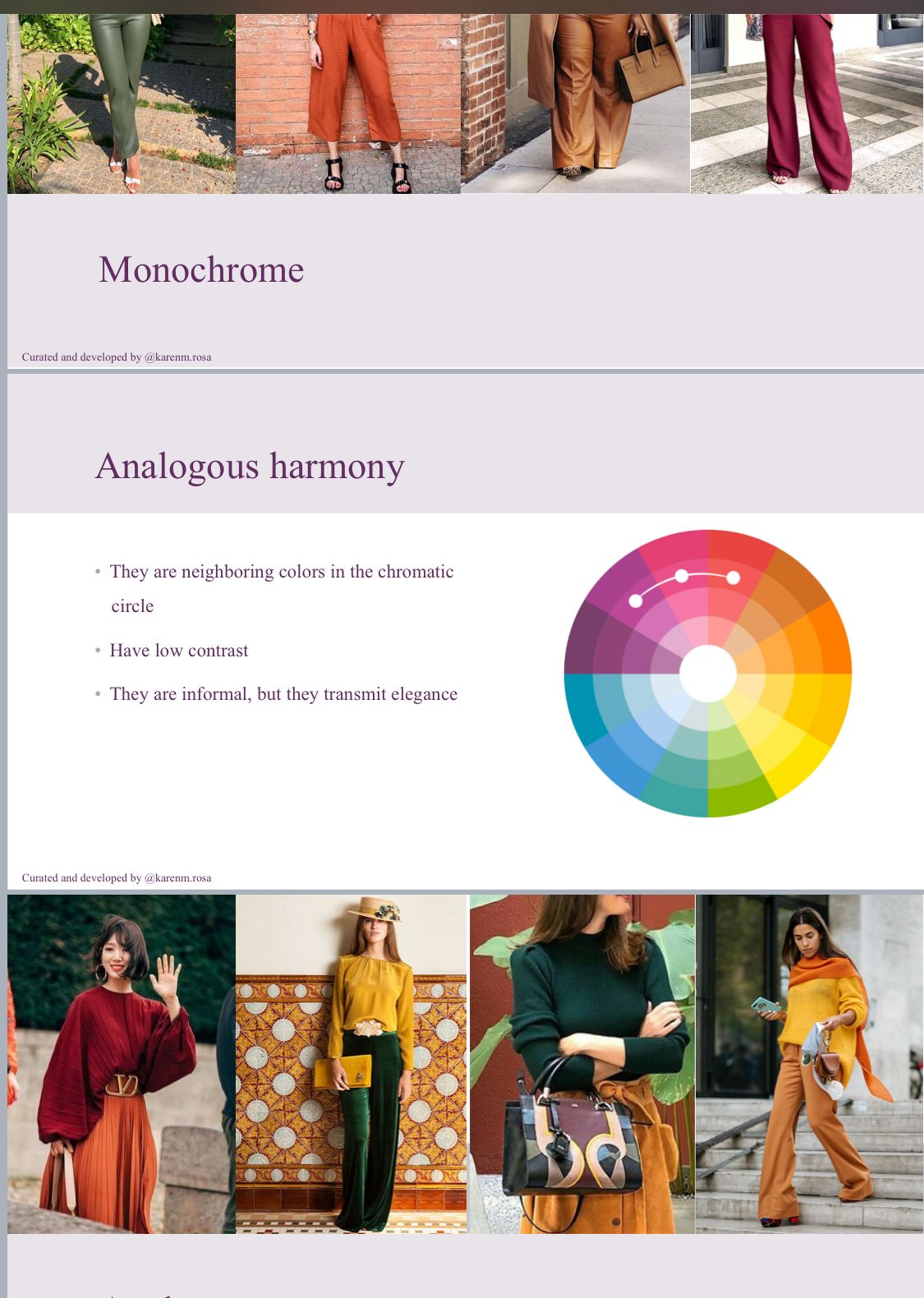 * Inspiring outfit combinations using your best colors, based on the color wheel