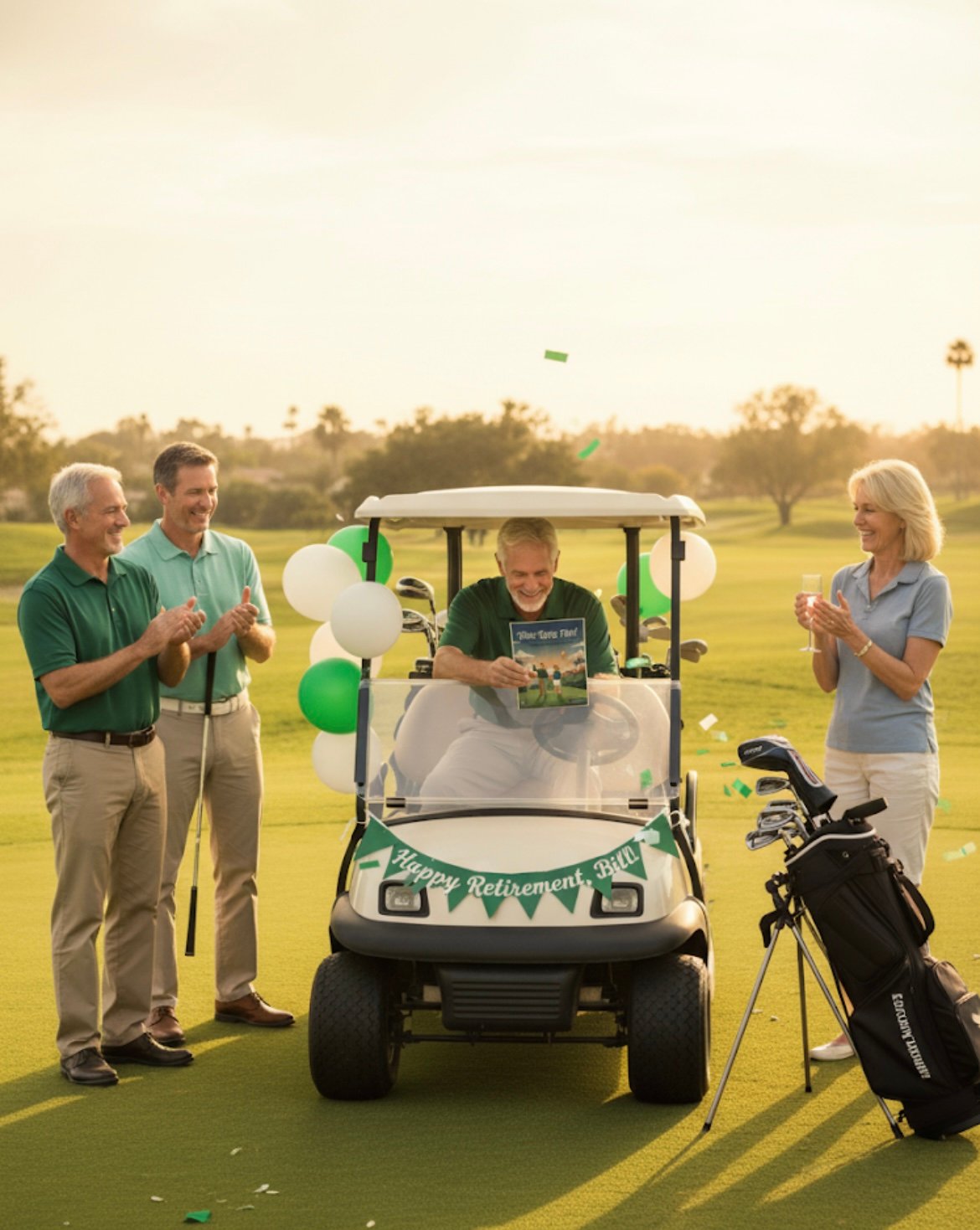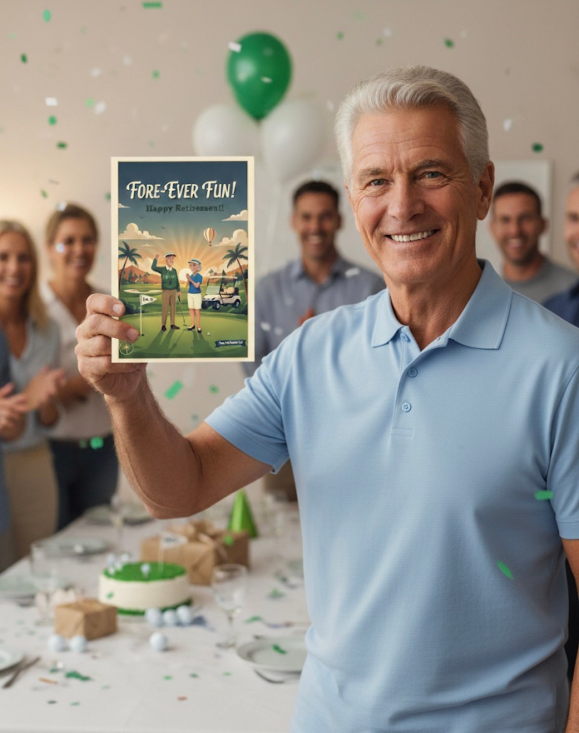 • Themed Artwork: Features elements like golf clubs, balls, and the phrase "Happy Retirement."
