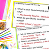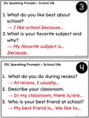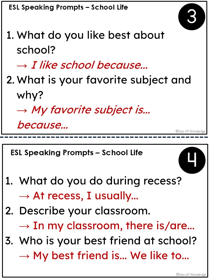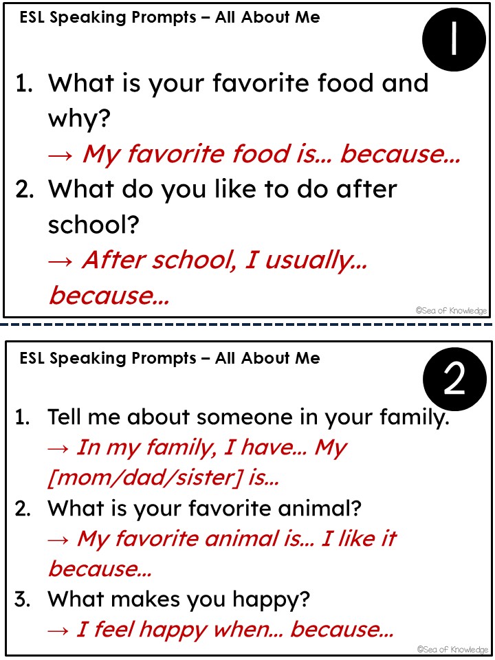 These fun, ready-to-use conversation cards are perfect for getting ESL students talking! Each card includes a speaking question with a sentence starter to guide their response — great for building confidence in full sentences.