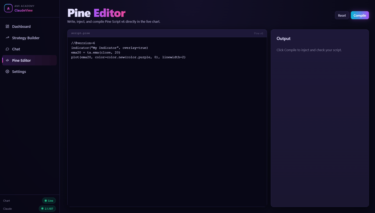 There is a full Pine Editor built in, but you are not required to write code yourself. You can describe a strategy or indicator in plain language and ClaudeView will generate it, debug it, and prepare it for use on your chart.