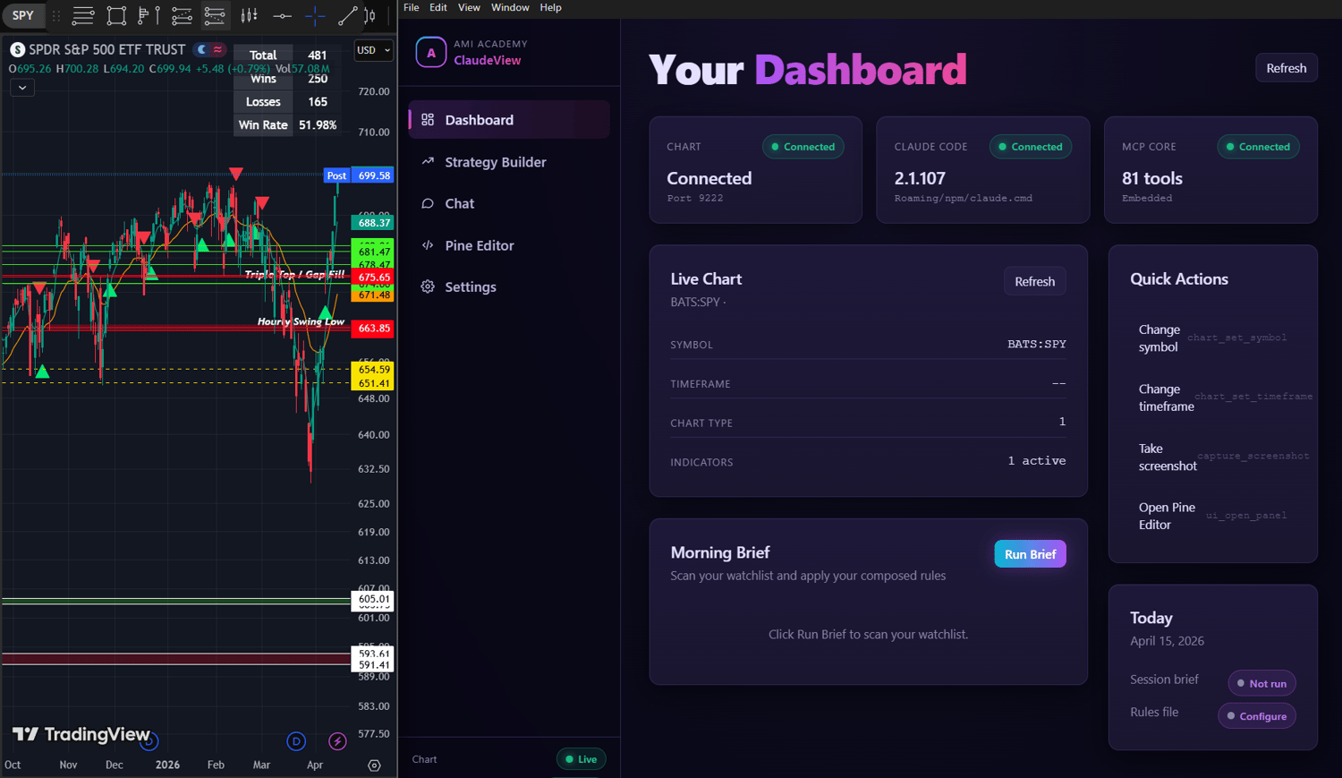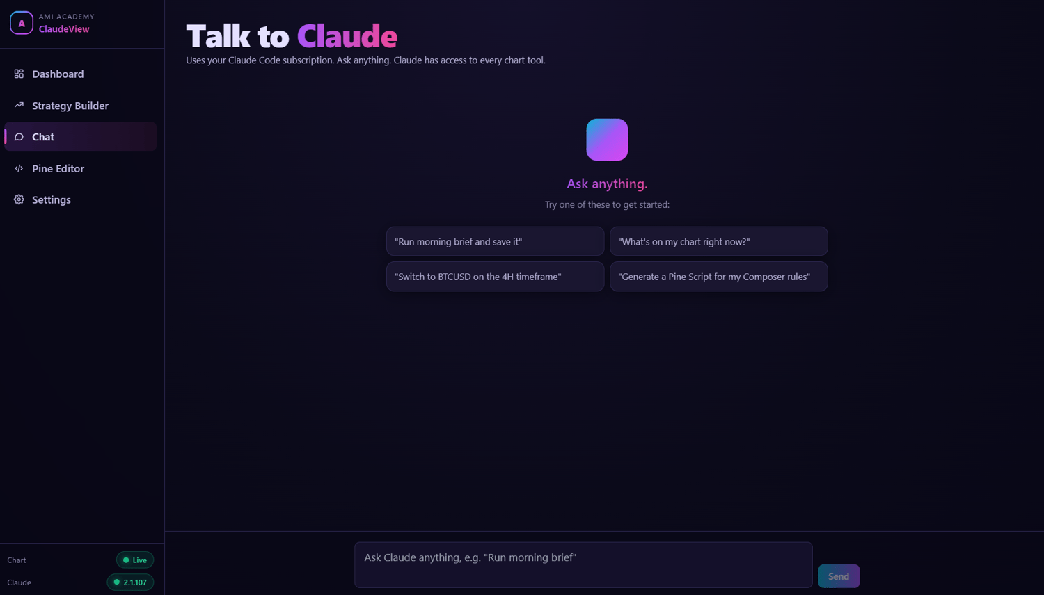 ClaudeView removes the need to constantly switch between analysis, execution, and coding. Instead of thinking in terms of tools and steps, you focus on intent. If you want to analyze a setup, test a strategy, or scan the market, you just say it and it happens.