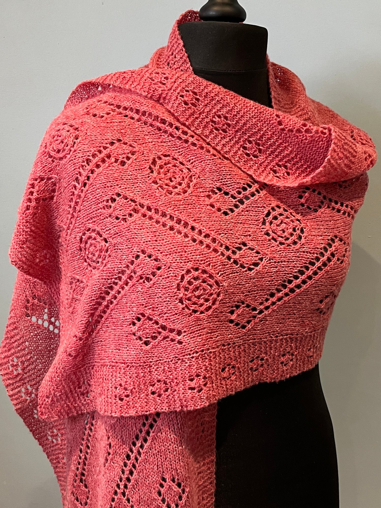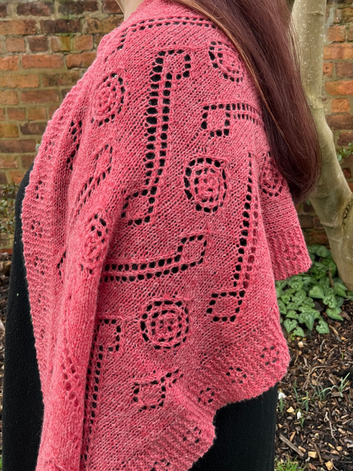 The repetition and placement of motifs gives the wrap balance and the wide garter stitch borders all around stop the fabric from curling inwards.