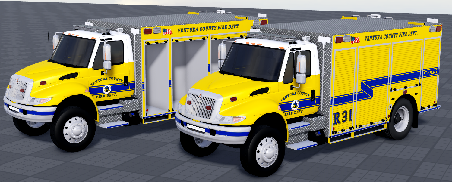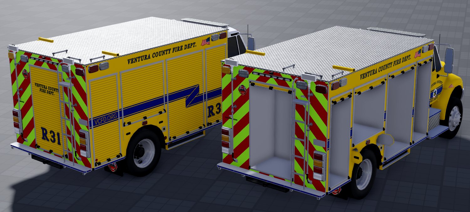 Based off of the Ventura County Fire Department Rescue 31 from Thousand Oaks. The livery and ELS is 99% accurate to real life. This includes 3 stages of ELS and 3 stages of directionals. The vehicle also comes with A-chassis so it isn't static. The vehicle doesn't come with any sirens so you will have to add your own. Each vehicle comes with two variants, one has opening compartments while the other doesn't. These include electronics which consist of headlights, blinkers, brakes, and much more!