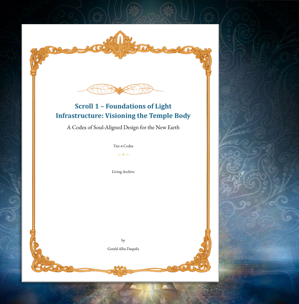 The "Codex of Soul-Aligned Design for the New Earth", Scroll 1: Visioning the Temple Body, introduces the Threshold Flame Scroll, showcasing a 12-part Light Infrastructure buildout through living temples aligned with divine design. It emphasizes the human body as a foundational blueprint, highlighting light as the essential building material. Attuning to this conscious foundation is key for sustainable infrastructure creation.