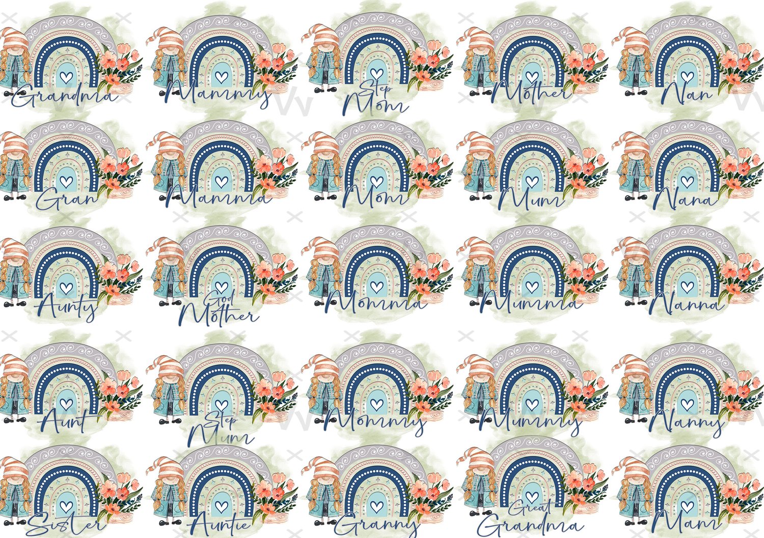25x Names (Aunt, Aunty, Auntie, God Mother, Gran, Grandma, Granny, Great Grandma, Ma, Madre, Mama, Mam, Mamma, Mammy, Mom, Momma, Mommy, Mum, Mumma, Mummy, Nana, Nan, Nanna, Nanny, Sister)