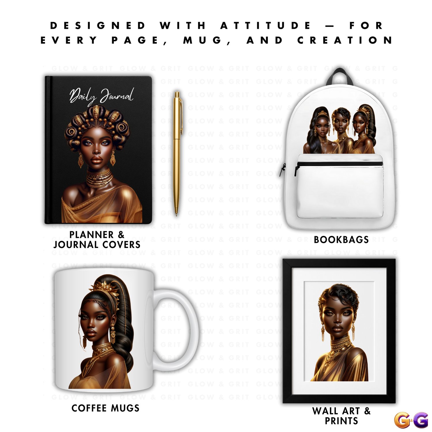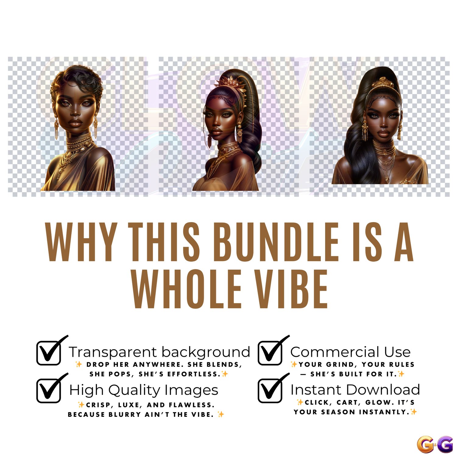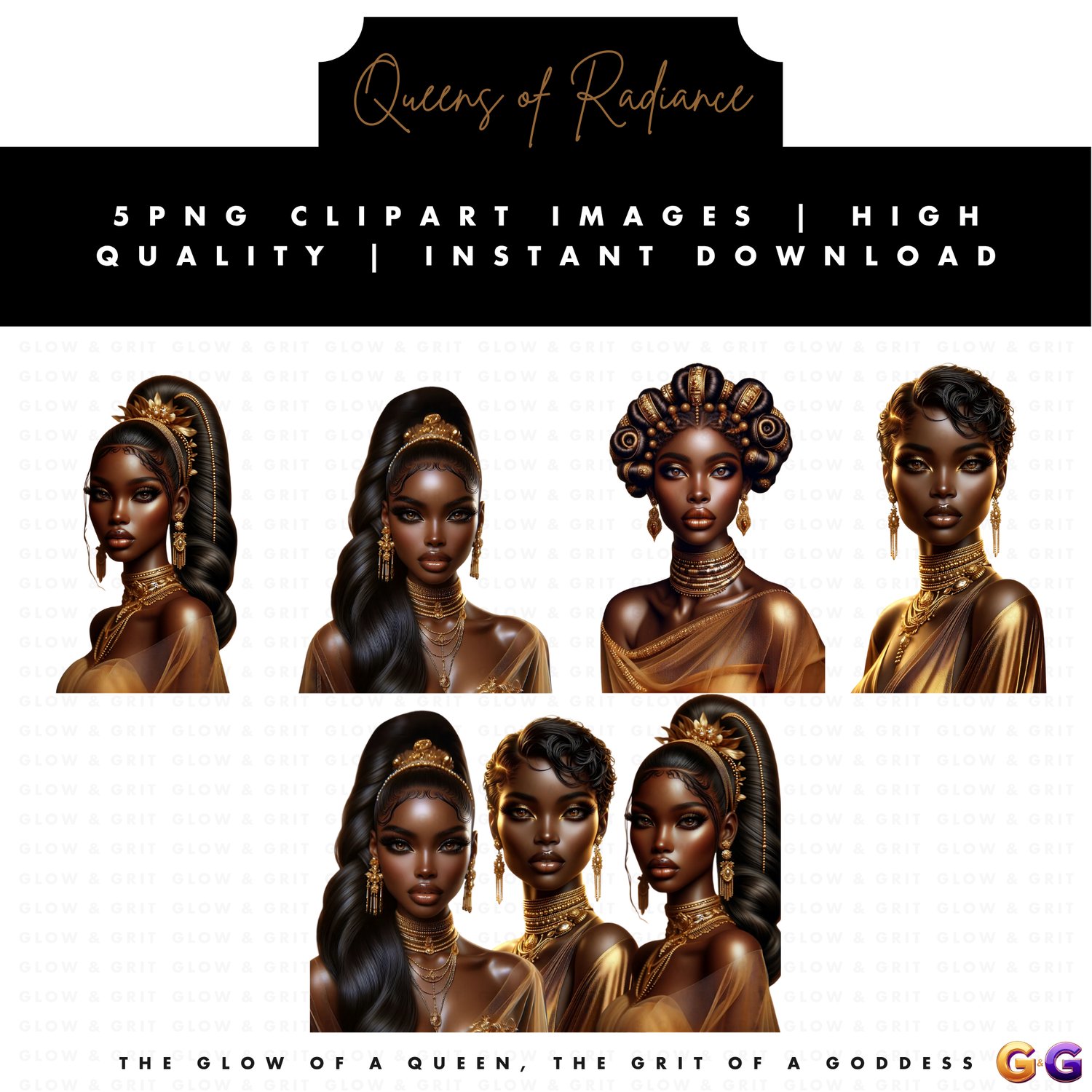Step into elegance with the Queens of Radiance Clipart Bundle, a luxe Glow & Grit collection celebrating regal beauty, cultural power, and unapologetic style. Perfect for planners, journals, wall art, apparel, and more.