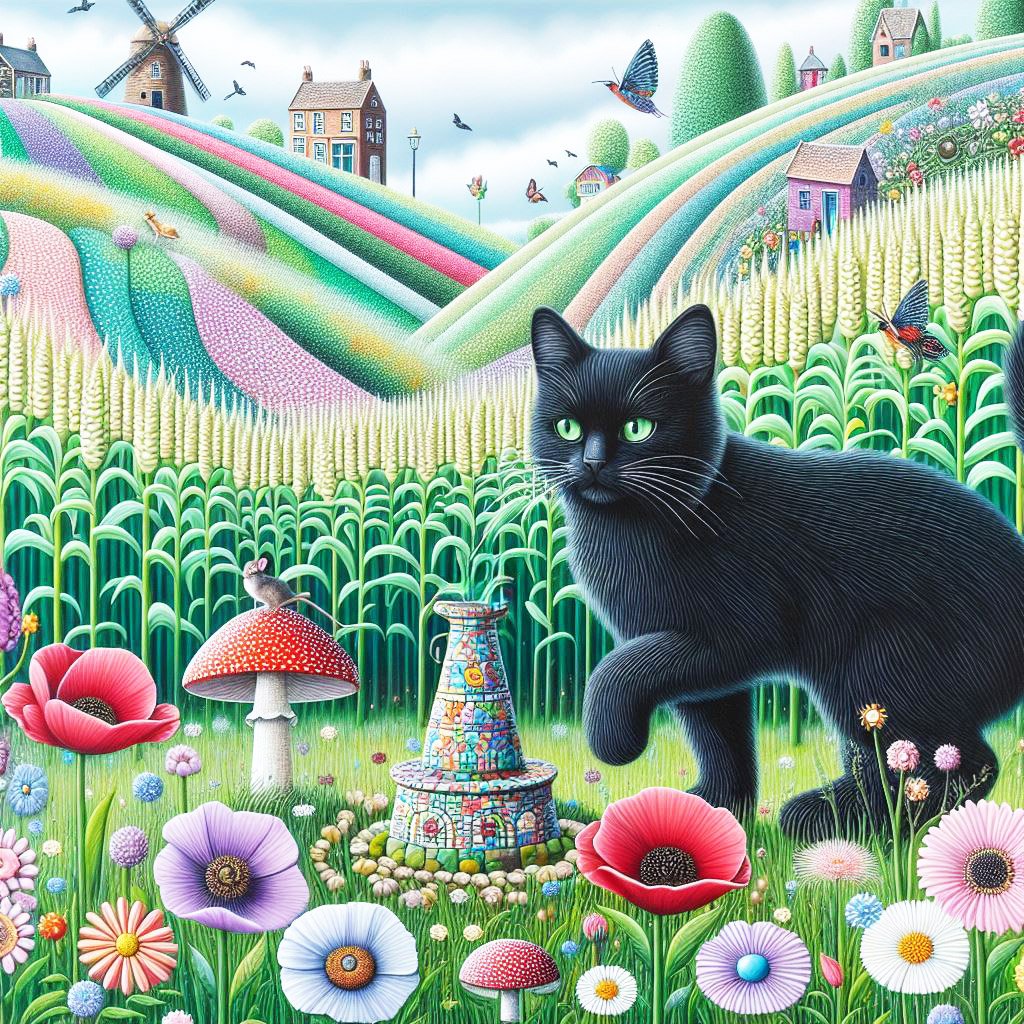 A black cat wandering through a corn field on high patterned hills with poppies, daisies, & toadstools. There are humming birds & butterflies. There is a colourful windmill & a mouse hides in a flower.