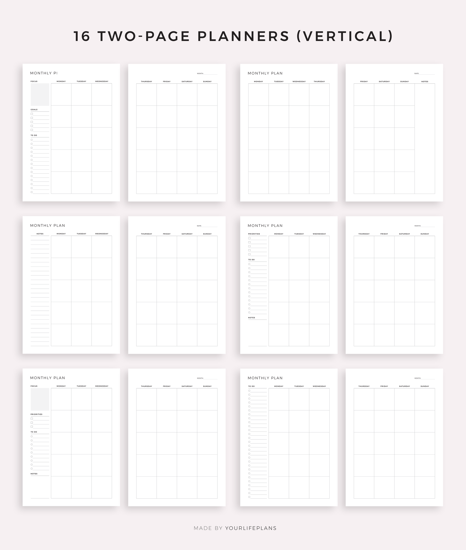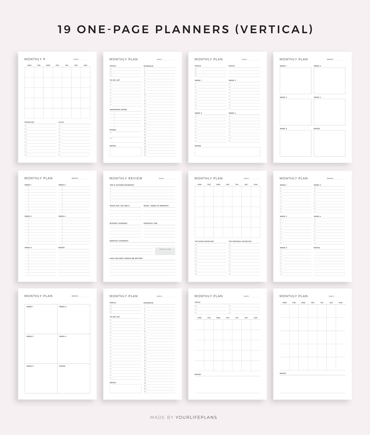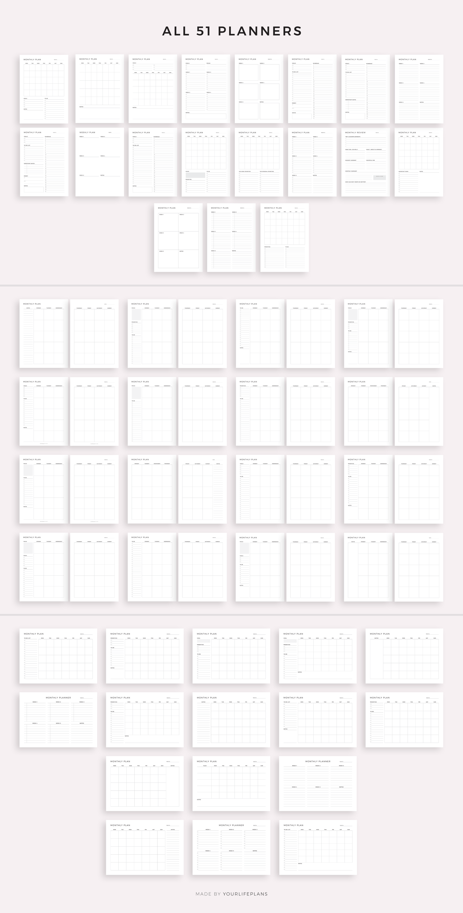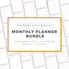 Monthly planner bundle. It includes 51 unique printable planners to choose from, that will help you manage your life and achieve your goals. Just download, print and get started right away!
