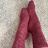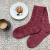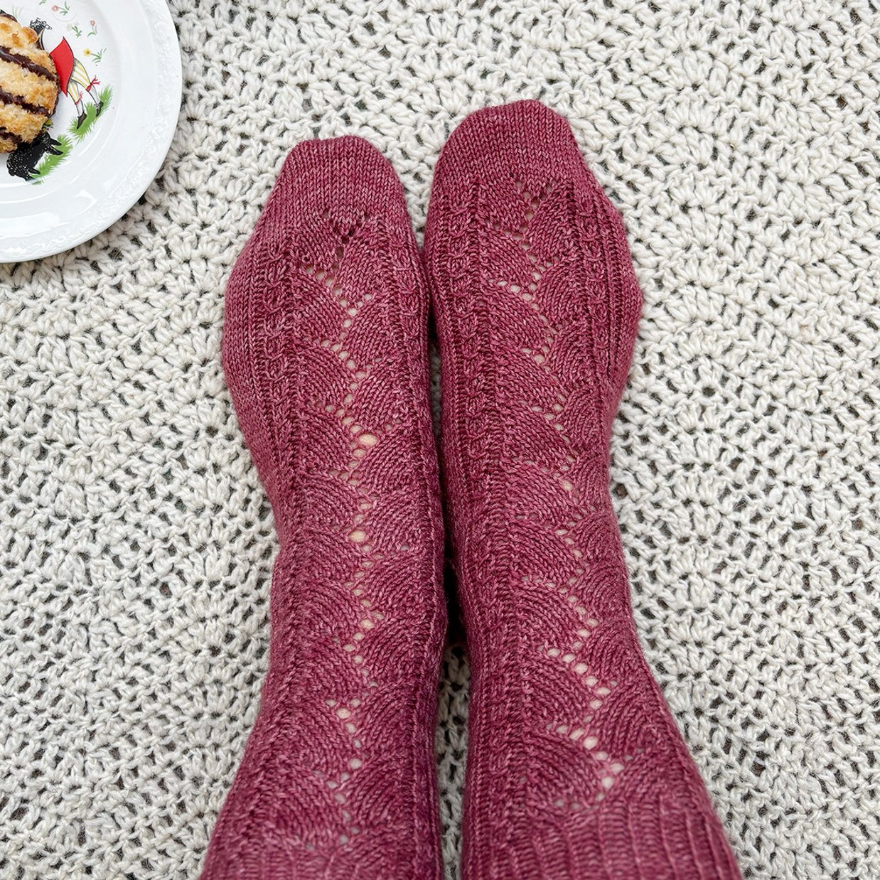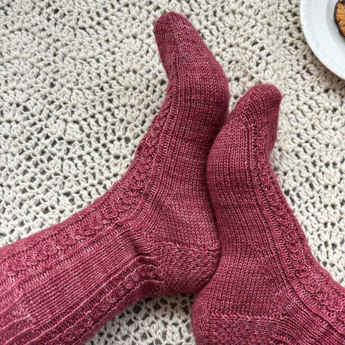 Worked from the cuff down, these mid-calf socks feature a lace and cable panel on the front and the back. When the desired length to heel is reached, you work a traditional heel flap in Eye of Partridge stitch which shows off this lovely yarn. After the heel turn the gusset is decreased to the same width as for the leg and then worked straight to the toe, which is grafted closed.