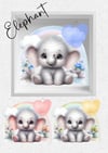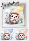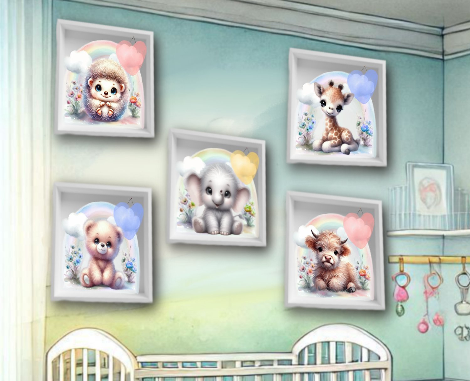 Adorable baby animals nursery design bundle; giraffe, teddy bear, Highland cow, elephant and hedgehog in blue, pink, lemon, with large heart to personalise