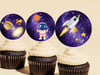 Outer space Cupcake Topper Birthday favor label Sticker Planets Rocket Ship Astronaut Galaxy Decor Solar System