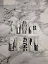 A white y2k set with 2010’s tumblr style moustache, a Union Jack, chrome details and cross charms. In a long square shape.