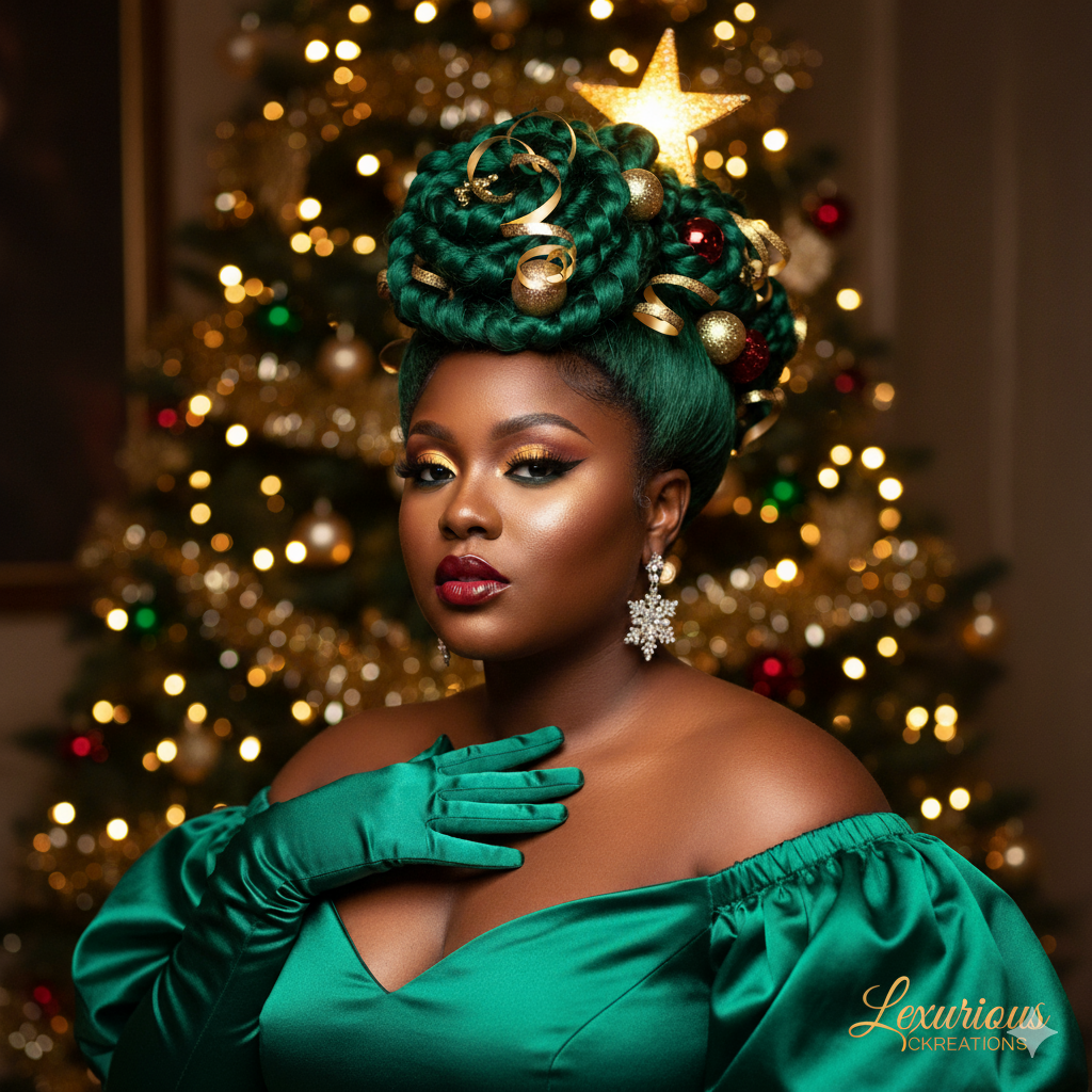 Celebrate the season with this realistic prompt featuring a glamorous African American woman styled in a bold couture holiday look. With an avant-garde Christmas tree wig adorned in emerald layers, golden ribbons, jewel-toned ornaments, and a glowing star topper, she embodies festive luxury.