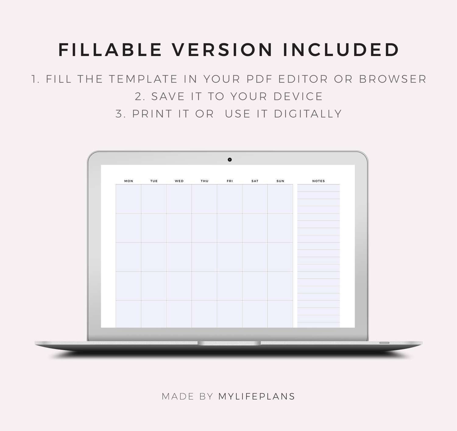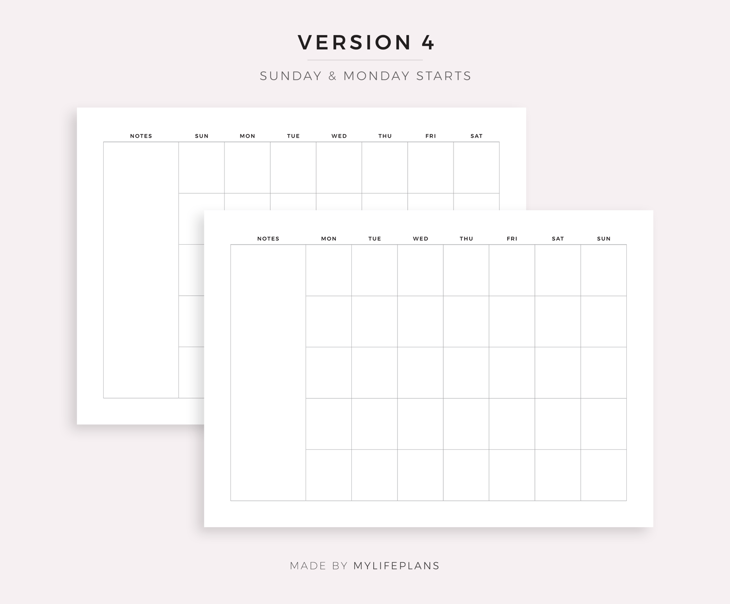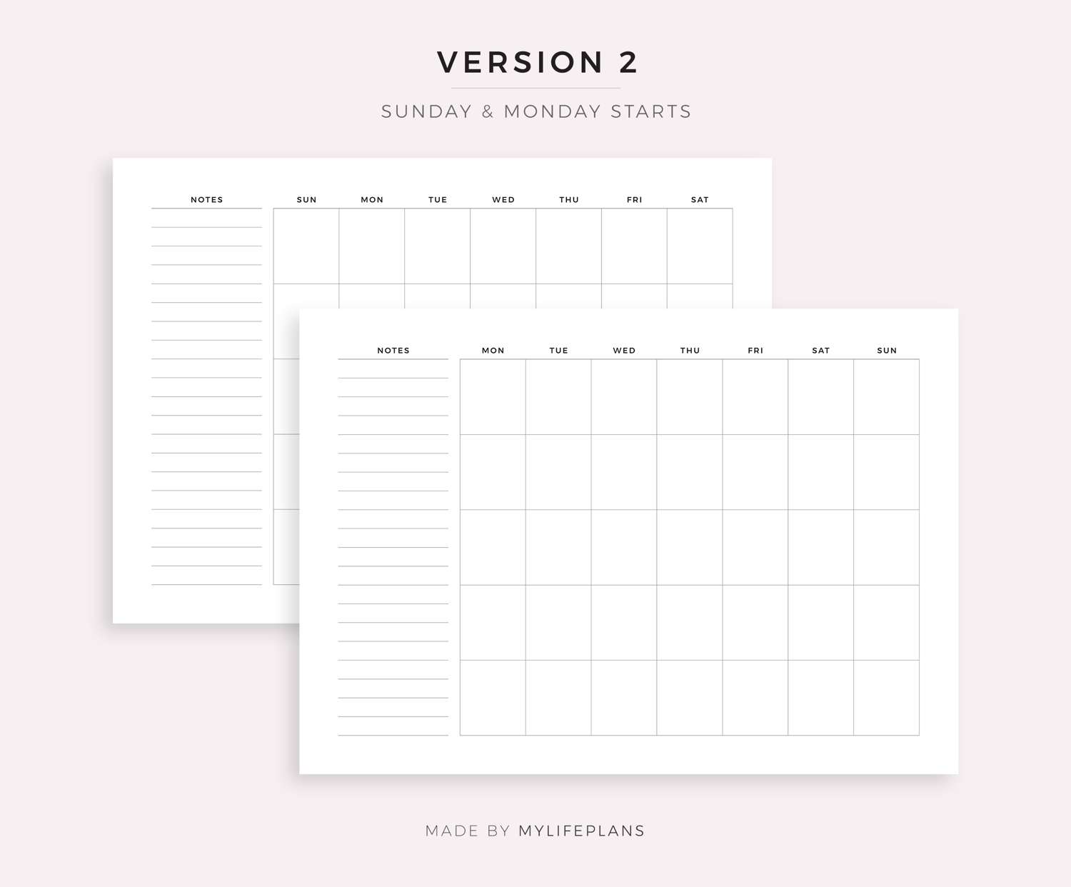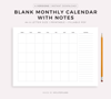 Blank Monthly Calendar with Notes, Landscape, Printable & Fillable, A4/Letter Size