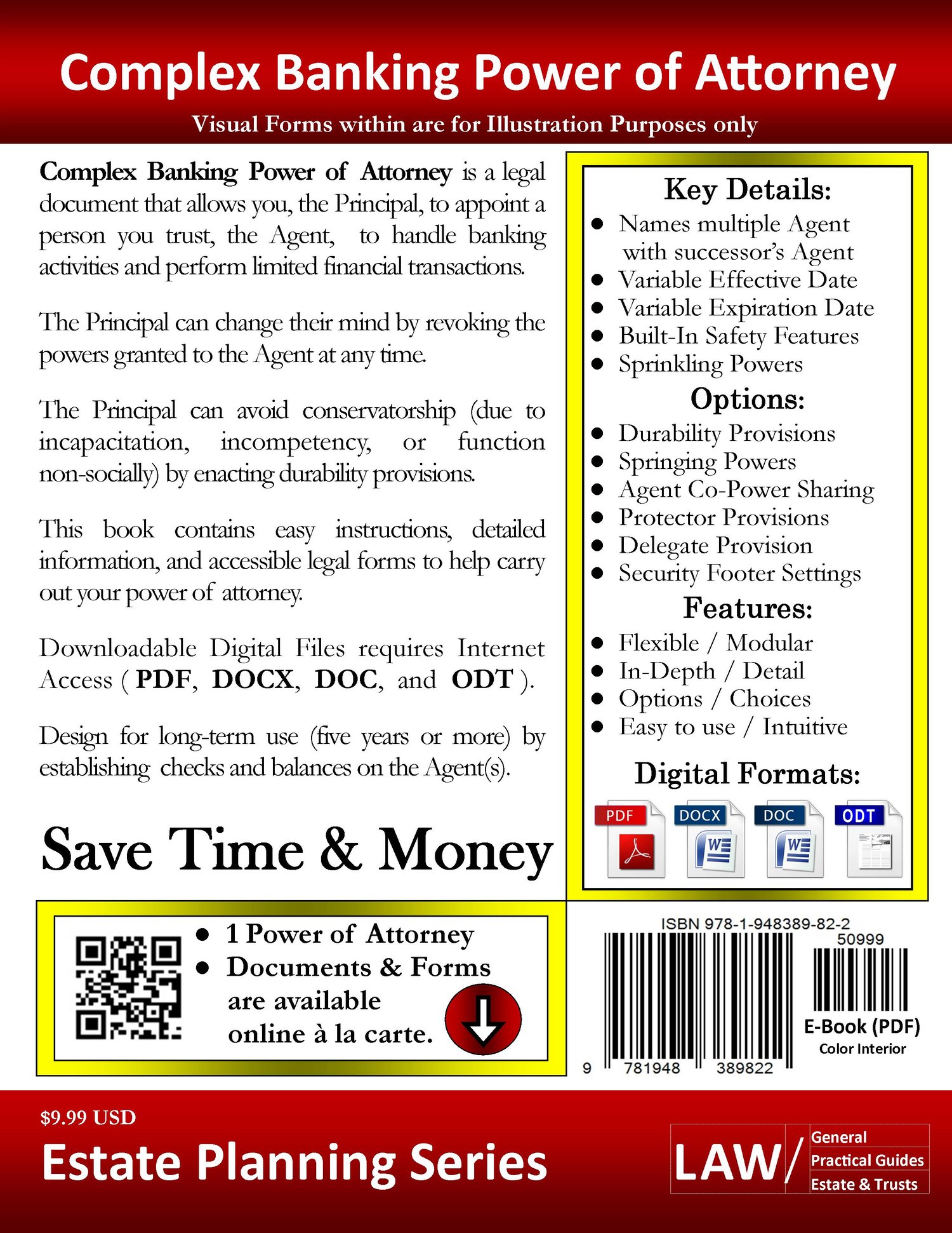 The book consists of (01) one Complex Power of Attorney (Banking). This Power of Attorney has an estate planning focus that provides options, depth, and flexibility while maintaining uniformity with built-in and optional safety features.